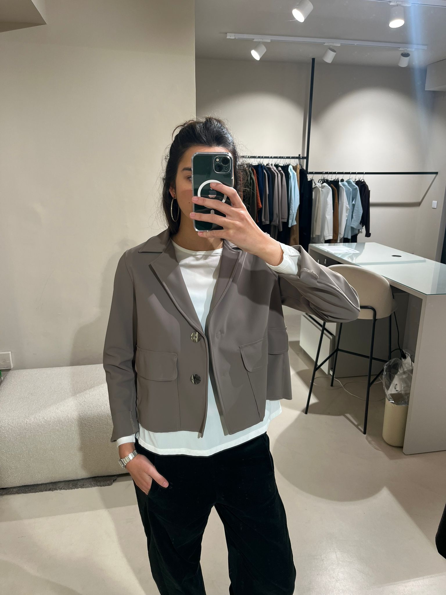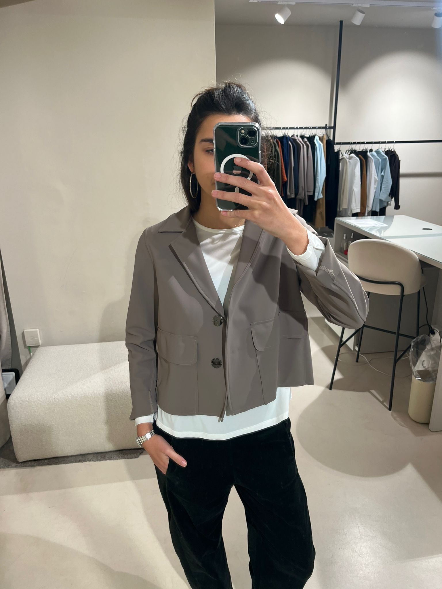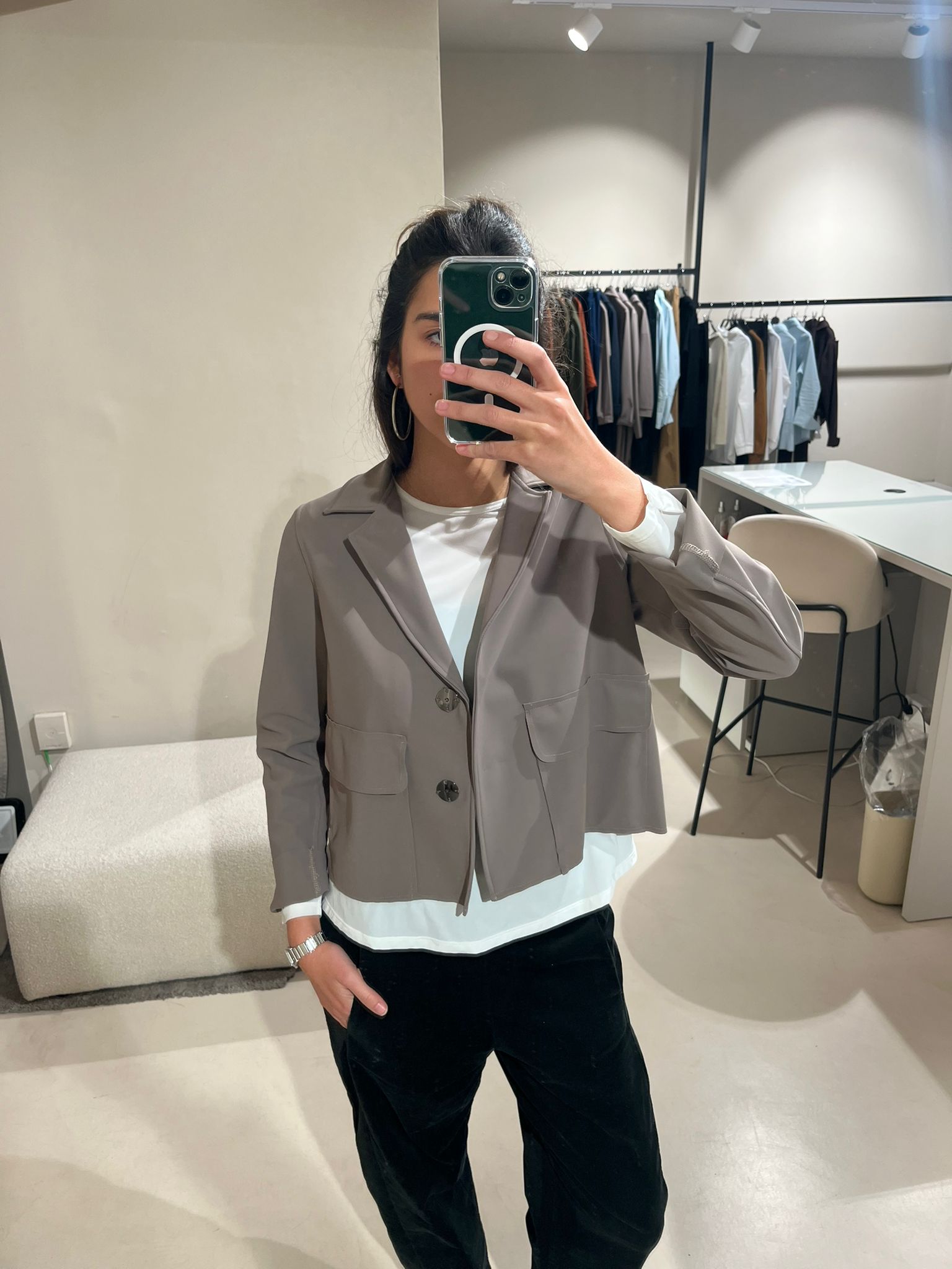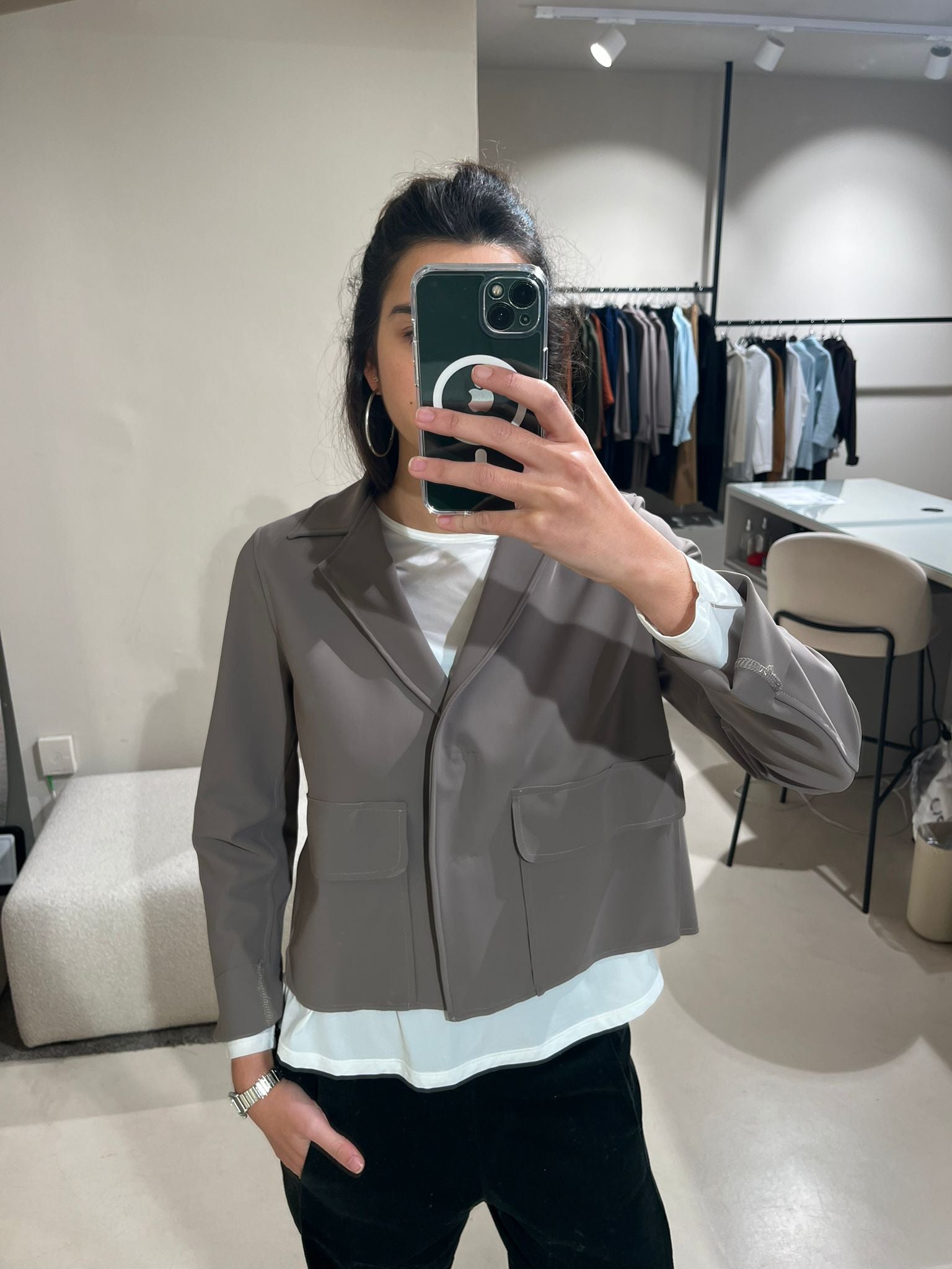 Gabardina corta de neopreno con un toque francés es una prenda imprescindible que combina elegancia y modernidad, diseñada para realzar cualquier look. El neopreno, con su textura estructurada y suave, aporta un aire contemporáneo y distintivo, manteniendo la forma y proporcionando comodidad en cada uso. Los bolsillos de solapa frontal son un detalle práctico y estiloso que complementa el diseño de la chaqueta, añadiendo funcionalidad sin sacrificar la estética. Estos bolsillos, además de ser útiles, aportan un toque de sofisticación, lo que hace que la prenda sea perfecta para quienes buscan un equilibrio entre estilo y practicidad.