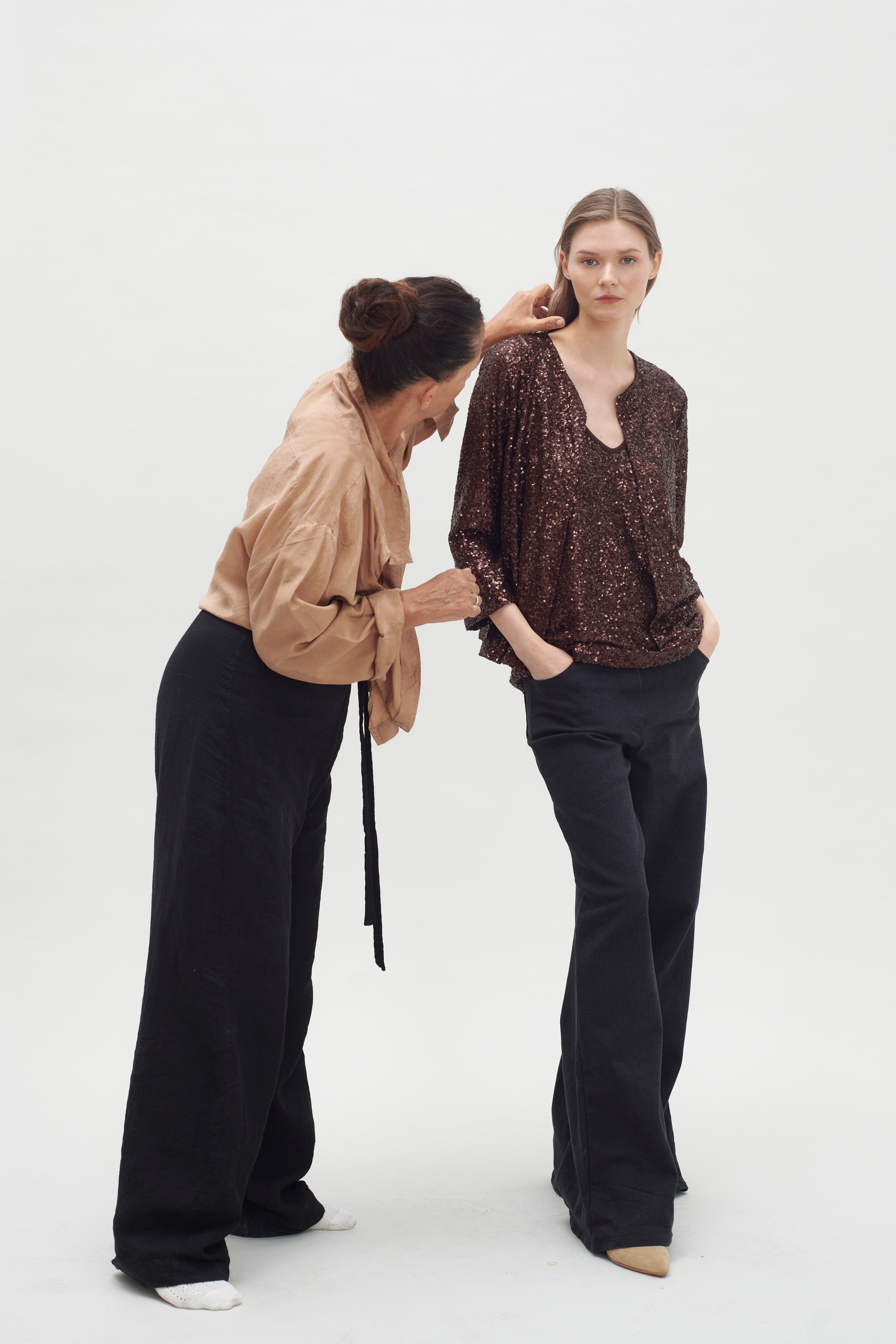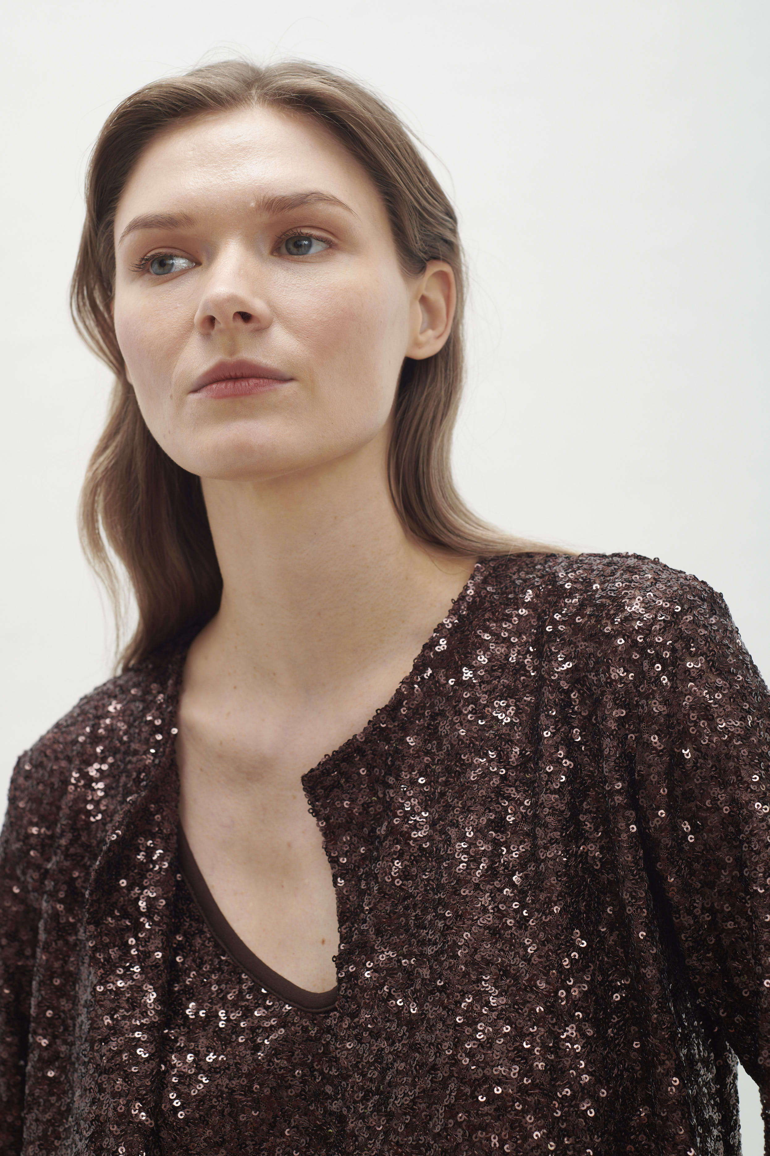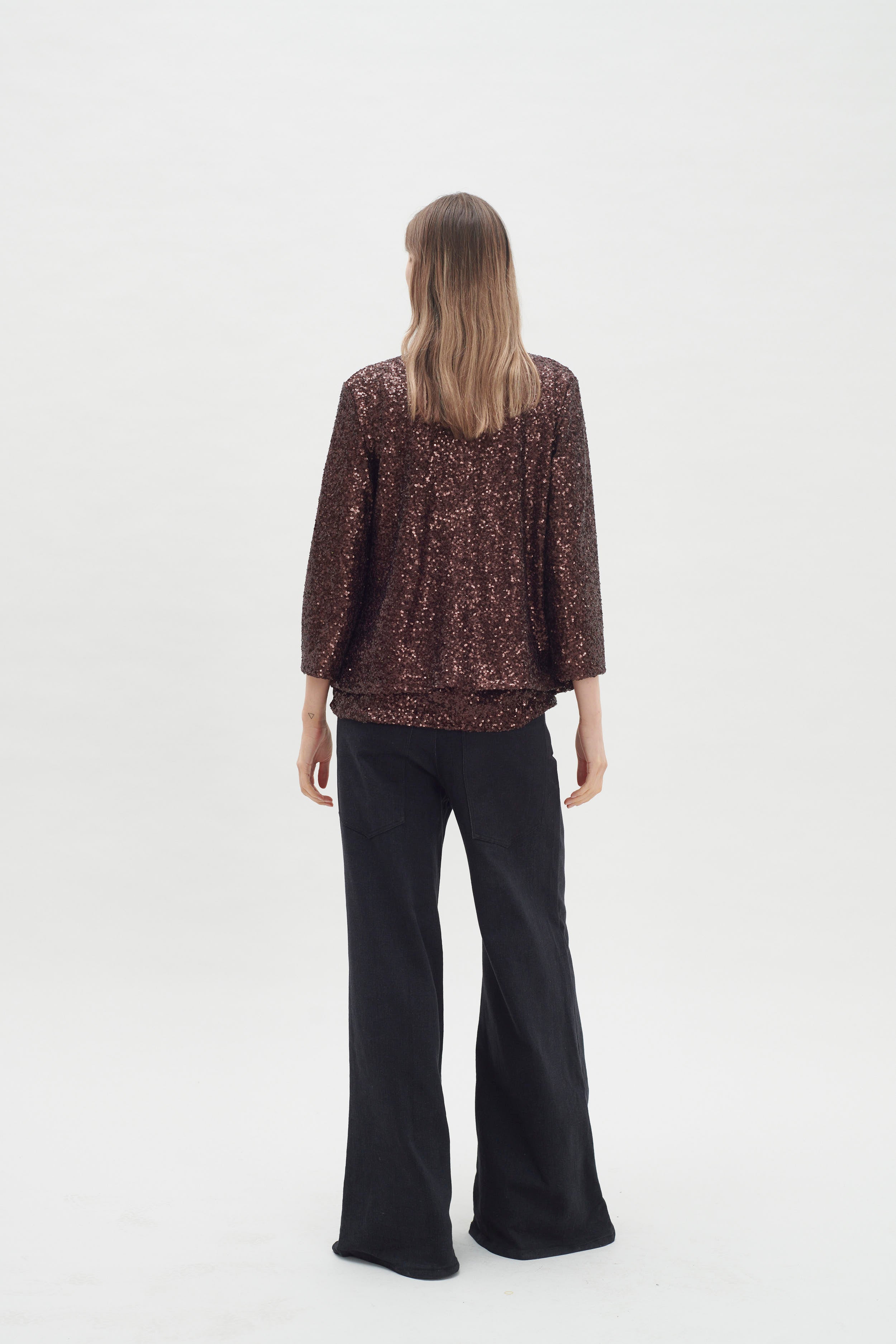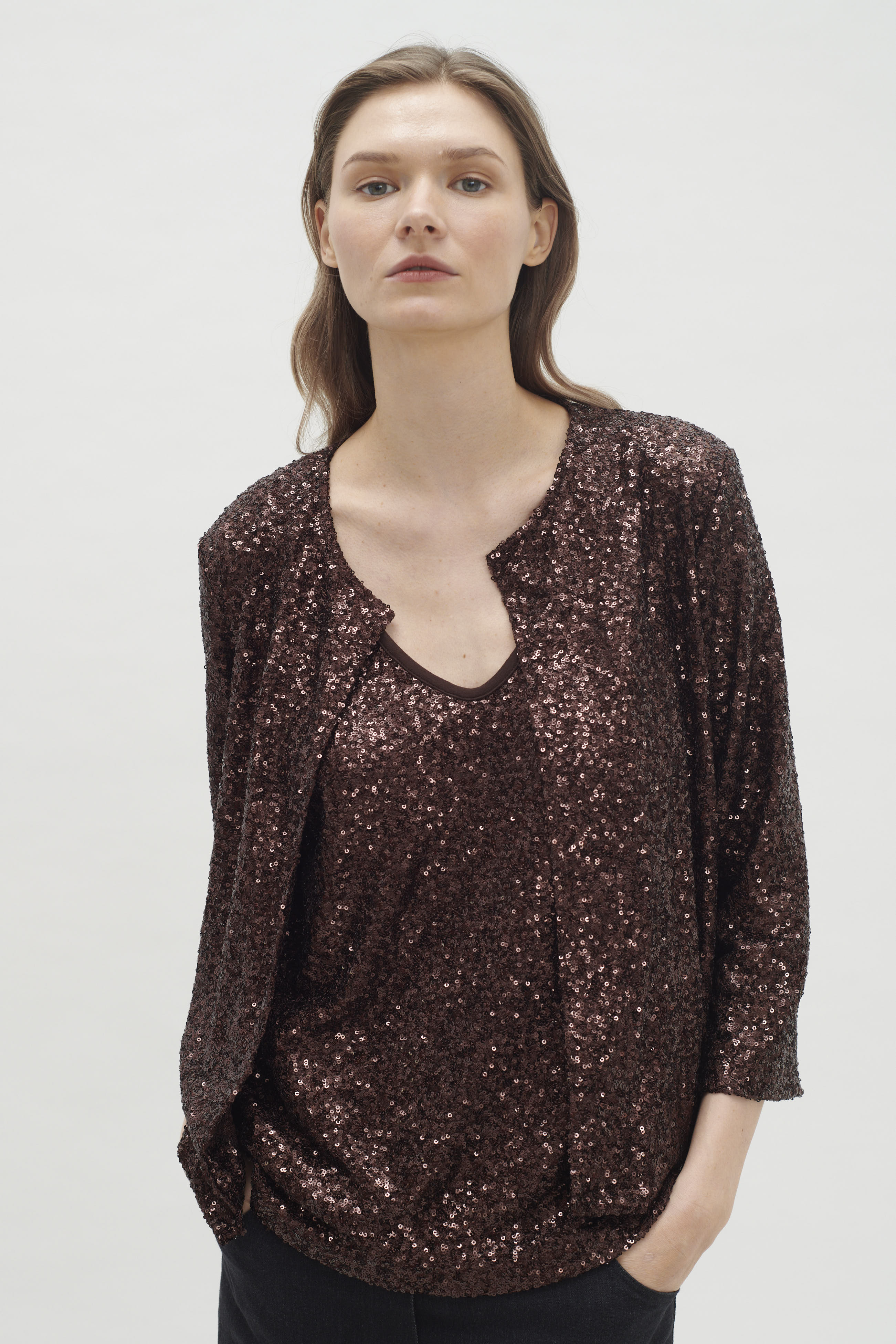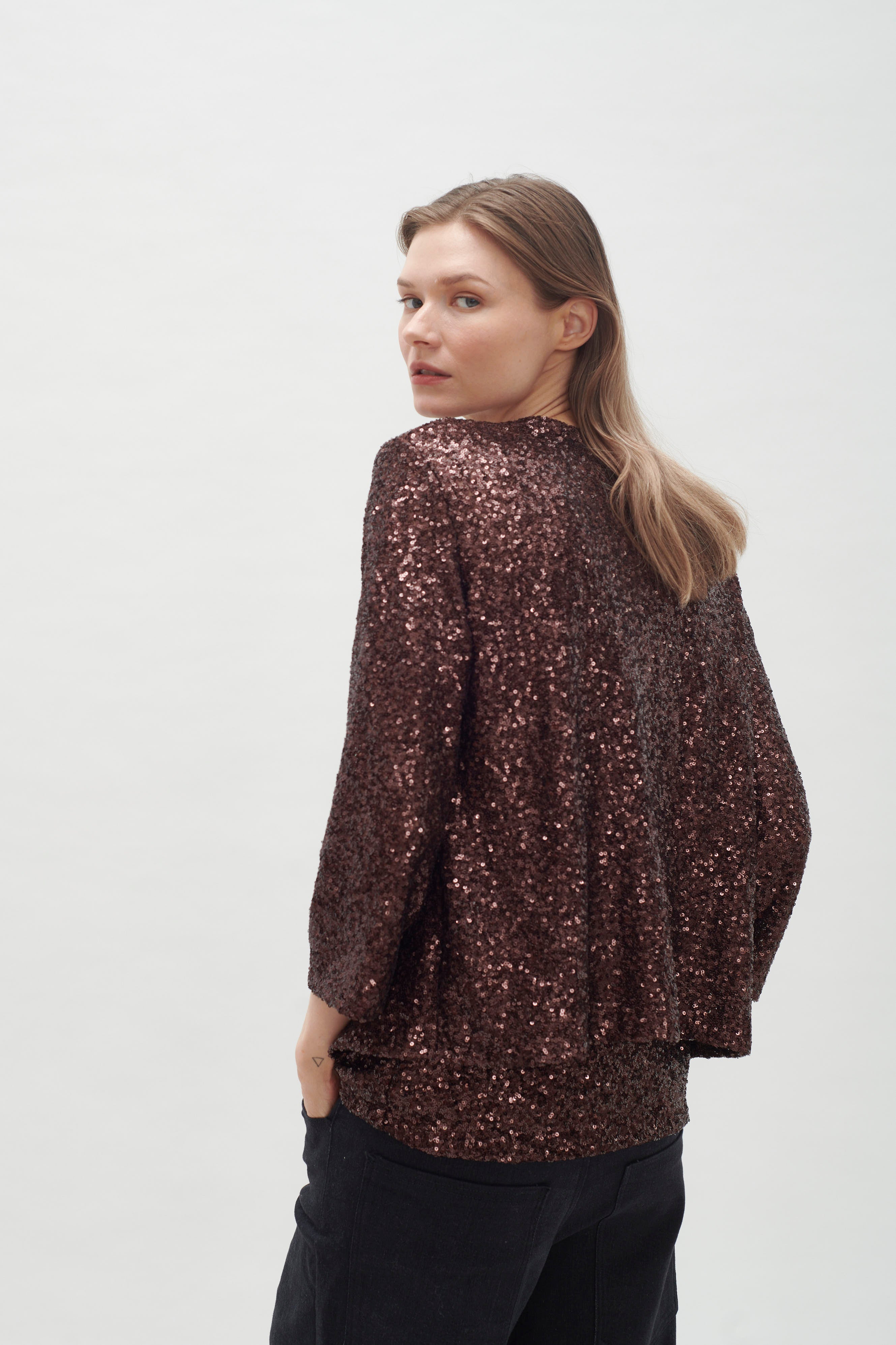 Es una prenda que irradia luz y sofisticación, convirtiéndose en la elección perfecta para elevar cualquier look de noche o festivo. La brillantez de los paillettes añade un efecto deslumbrante, capturando la luz y creando un impacto visual que no pasa desapercibido. Su diseño puede variar desde siluetas ajustadas hasta cortes más relajados, pero, sin duda, cada opción aporta un aire glamuroso y moderno. Esta chaqueta es ideal para combinar con una variedad de atuendos, desde un vestido sencillo hasta un conjunto de pantalones de cuero o una blusa elegante y jeans, transformando instantáneamente cualquier look en algo especial y festivo