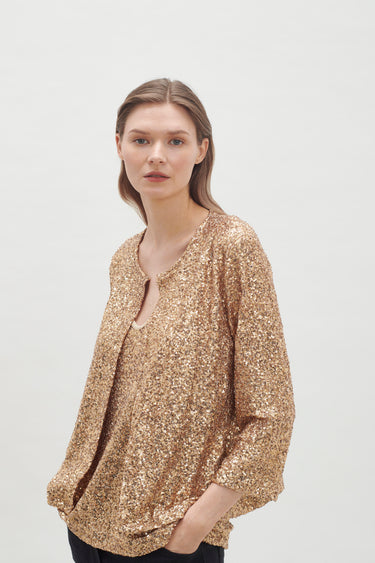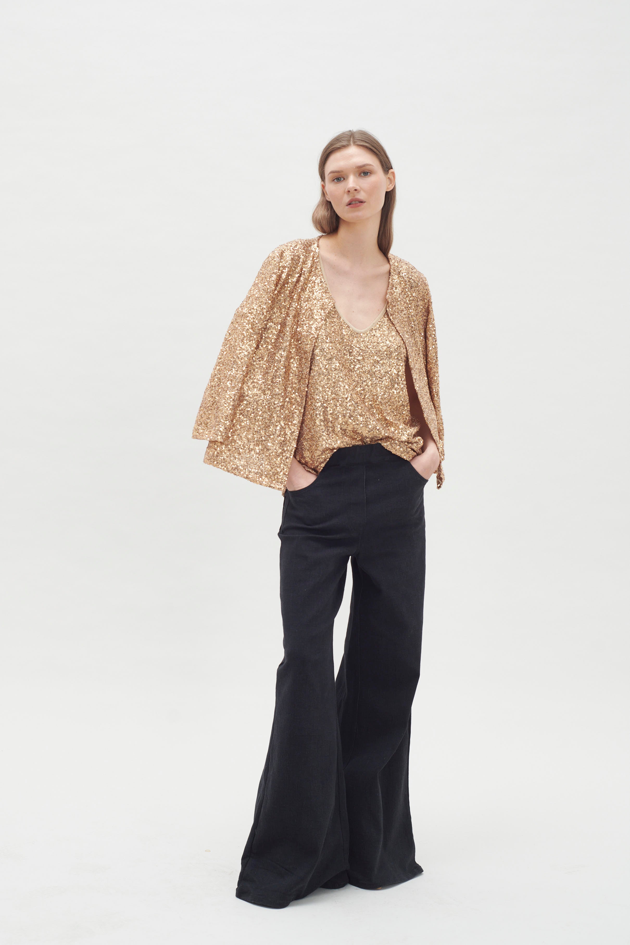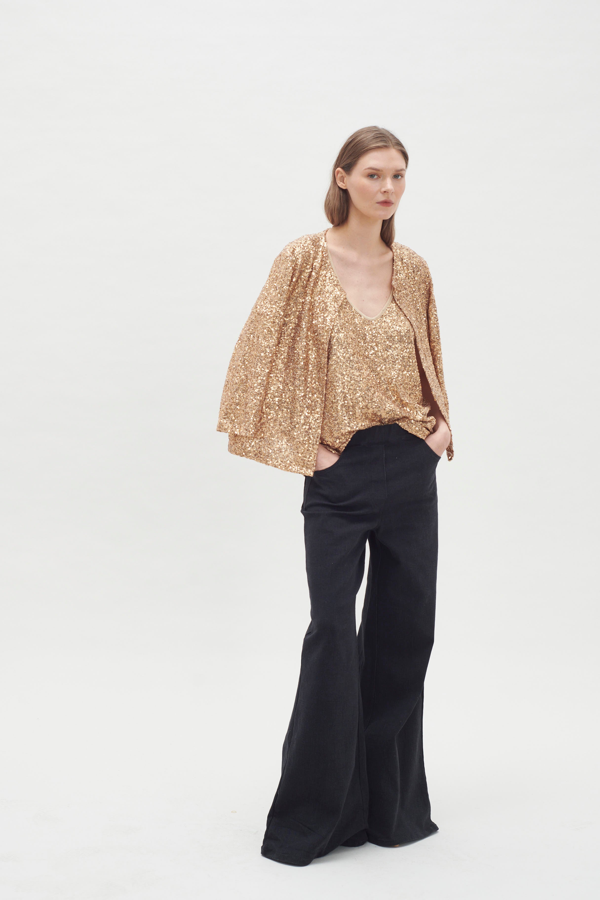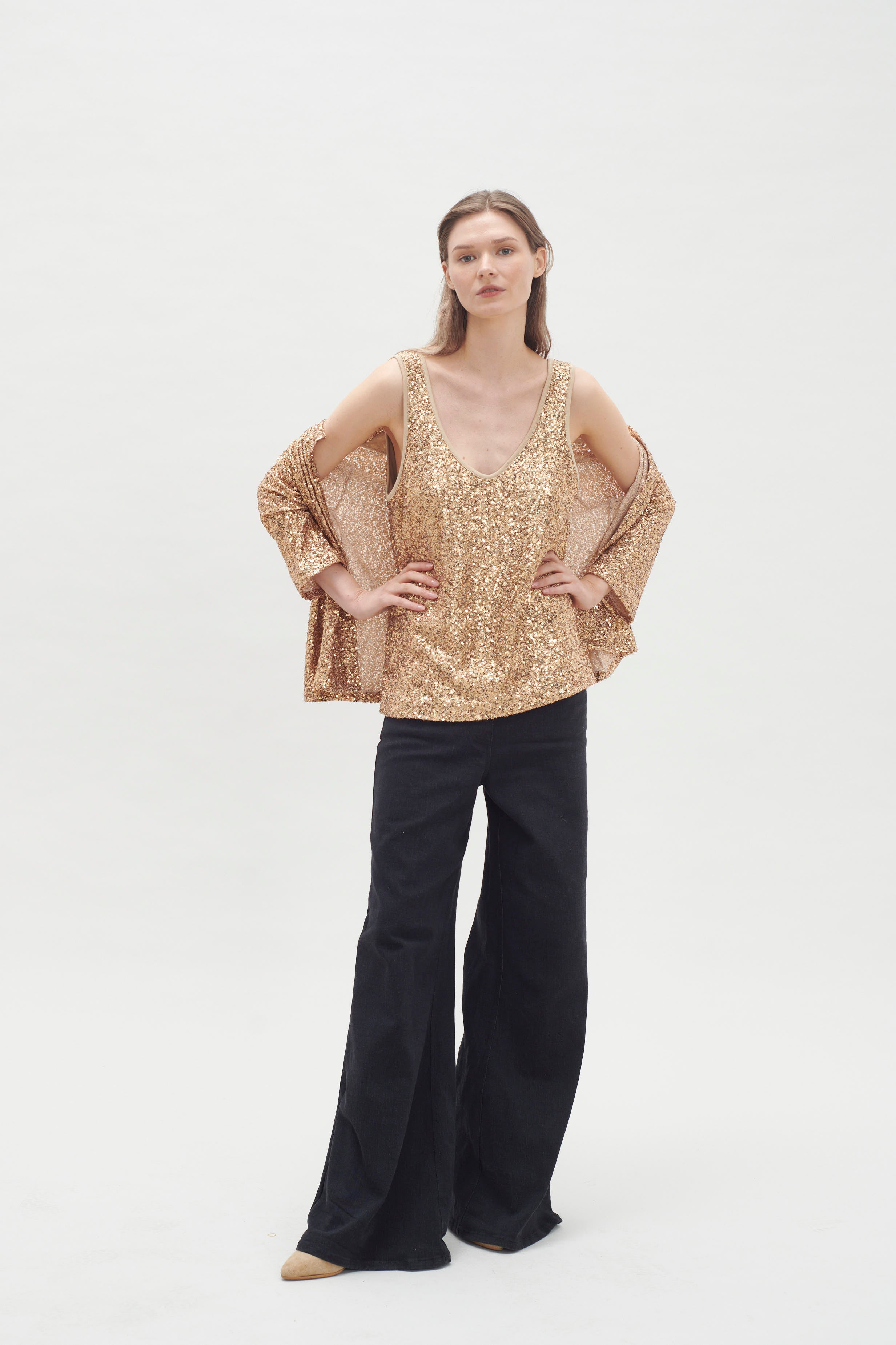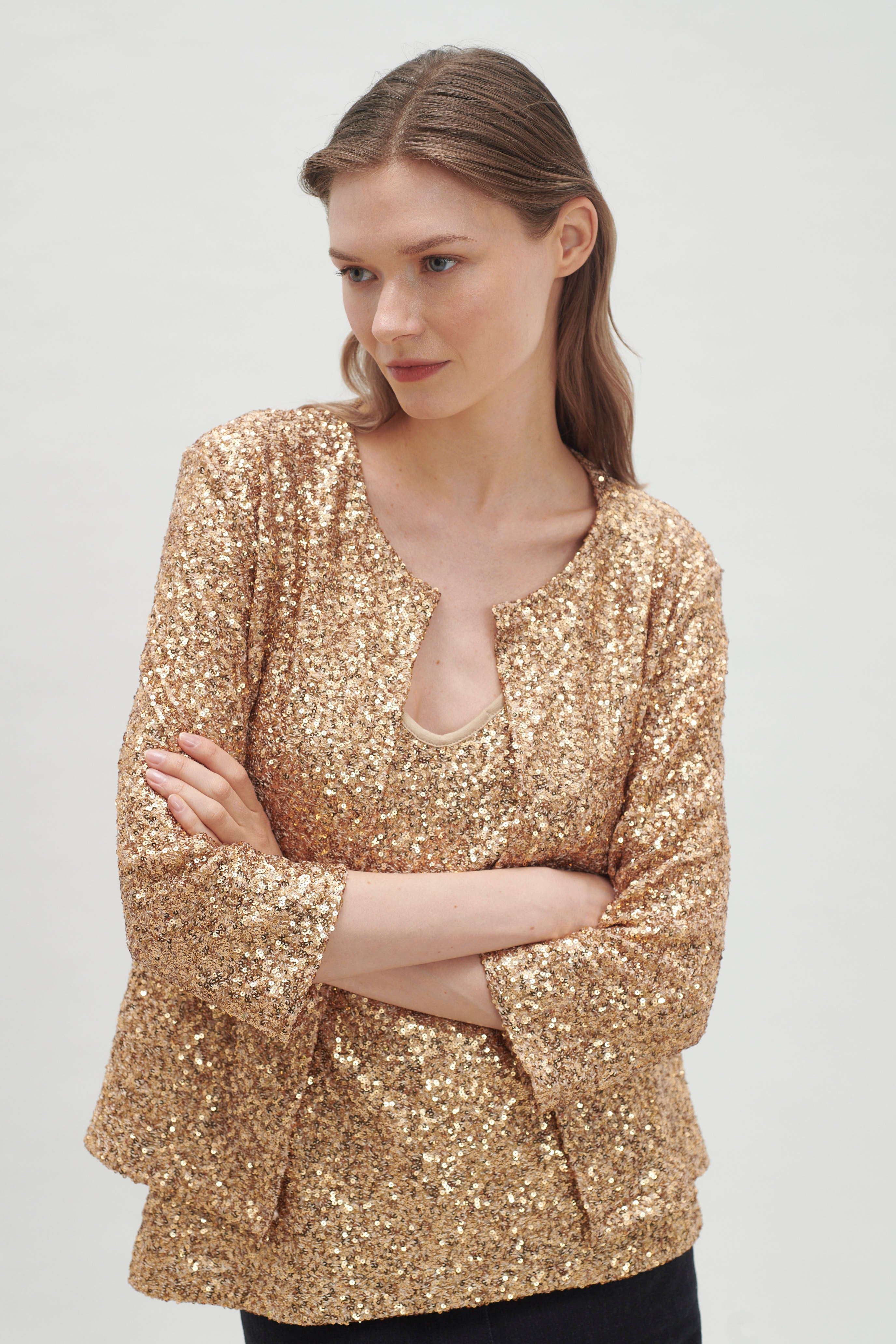 Es una prenda que irradia luz y sofisticación, convirtiéndose en la elección perfecta para elevar cualquier look de noche o festivo. La brillantez de los paillettes añade un efecto deslumbrante, capturando la luz y creando un impacto visual que no pasa desapercibido. Su diseño puede variar desde siluetas ajustadas hasta cortes más relajados, pero, sin duda, cada opción aporta un aire glamuroso y moderno. Esta chaqueta es ideal para combinar con una variedad de atuendos, desde un vestido sencillo hasta un conjunto de pantalones de cuero o una blusa elegante y jeans, transformando instantáneamente cualquier look en algo especial y festivo