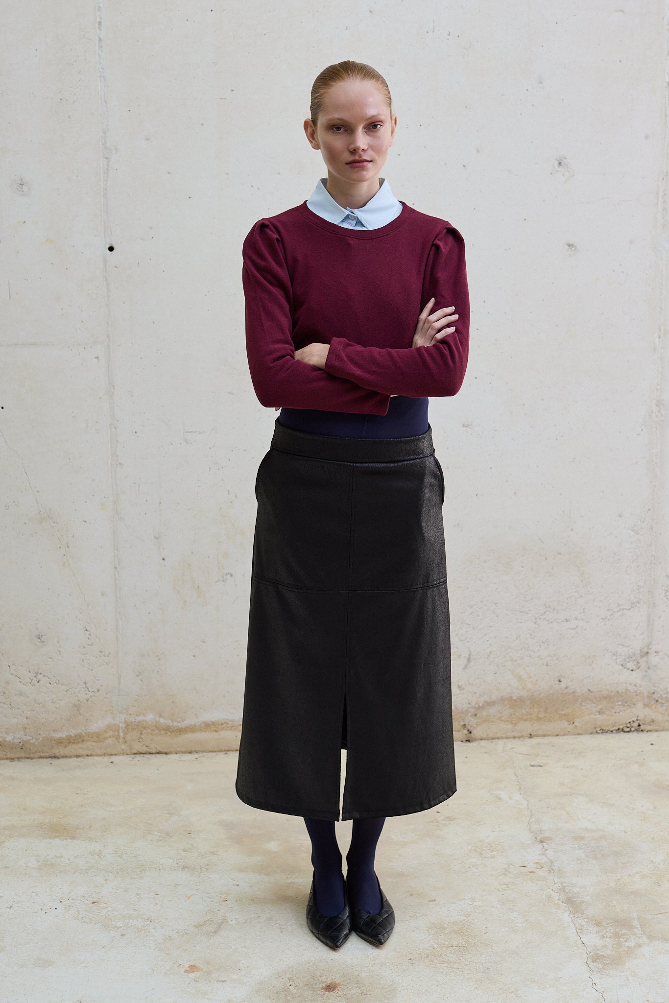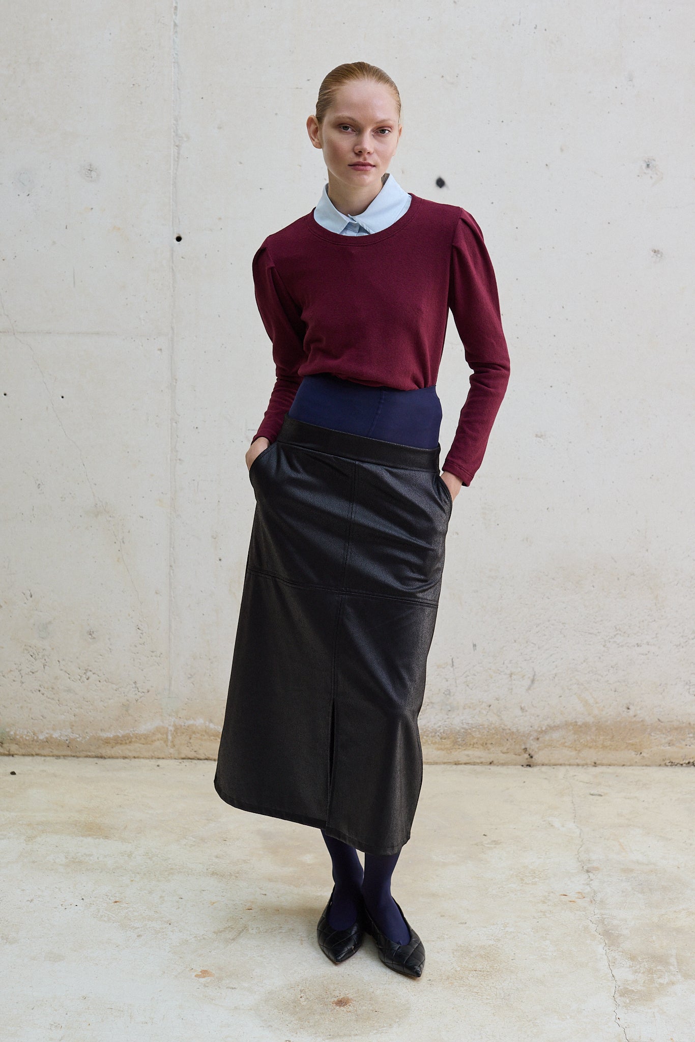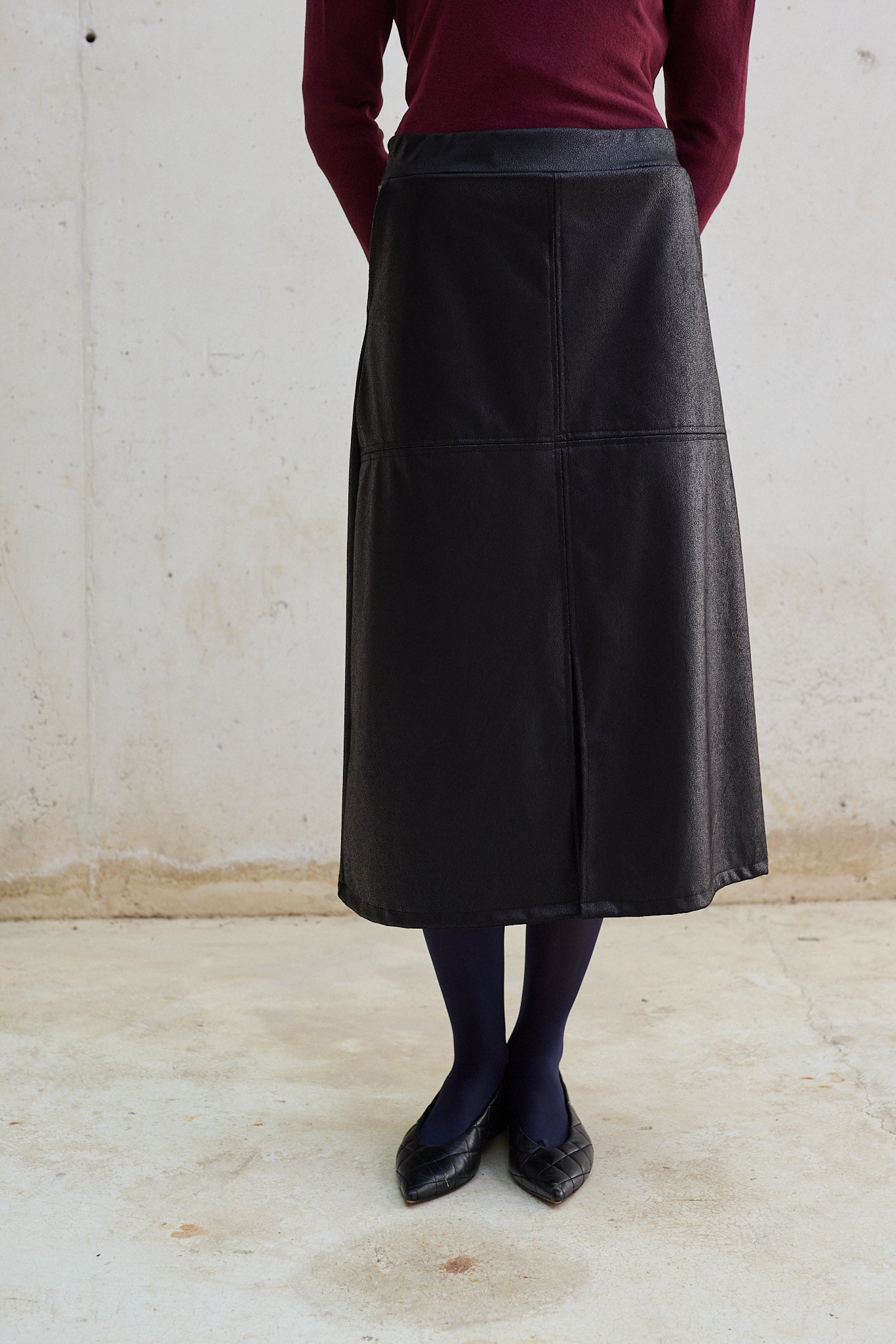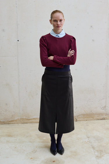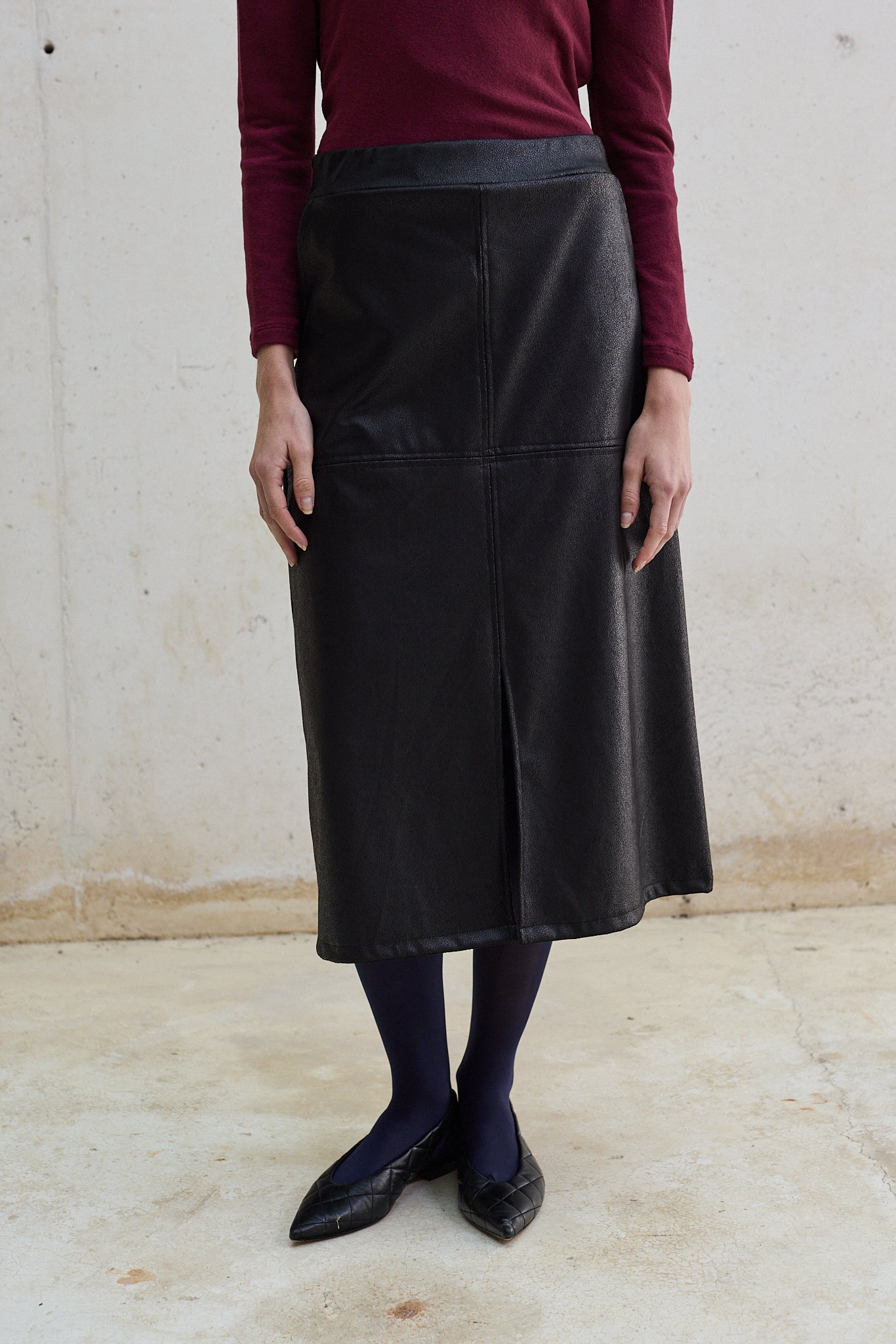 Falda midi efecto piel, con cintura elástica que se adapta a la silueta y un diseño que queda ajustado en la cadera para realzar la figura. Incorpora un corte frontal que aporta movimiento y un toque moderno. Una pieza versátil que puedes llevar tanto en looks de día con zapatillas, como en outfits de noche con tacones.