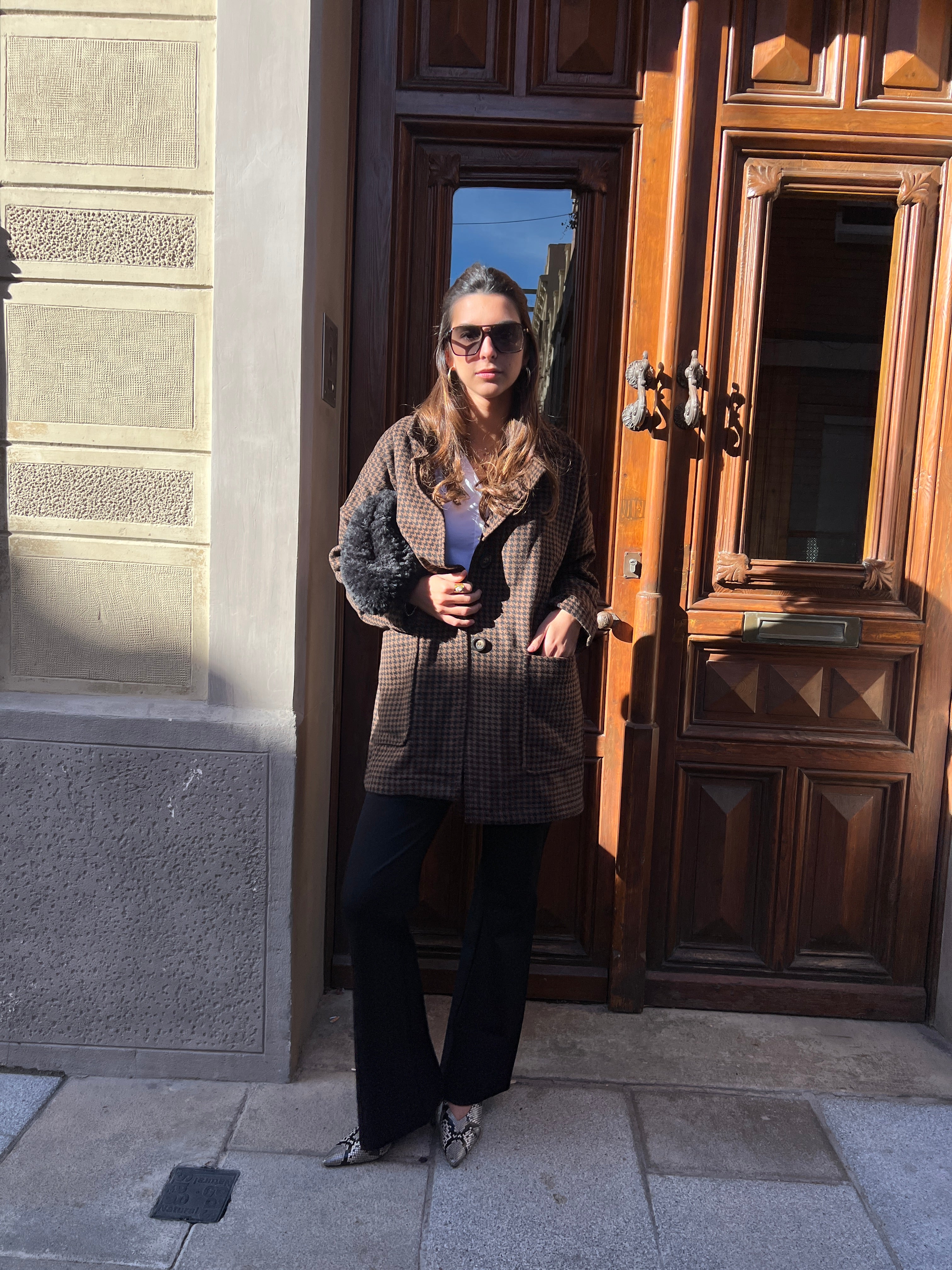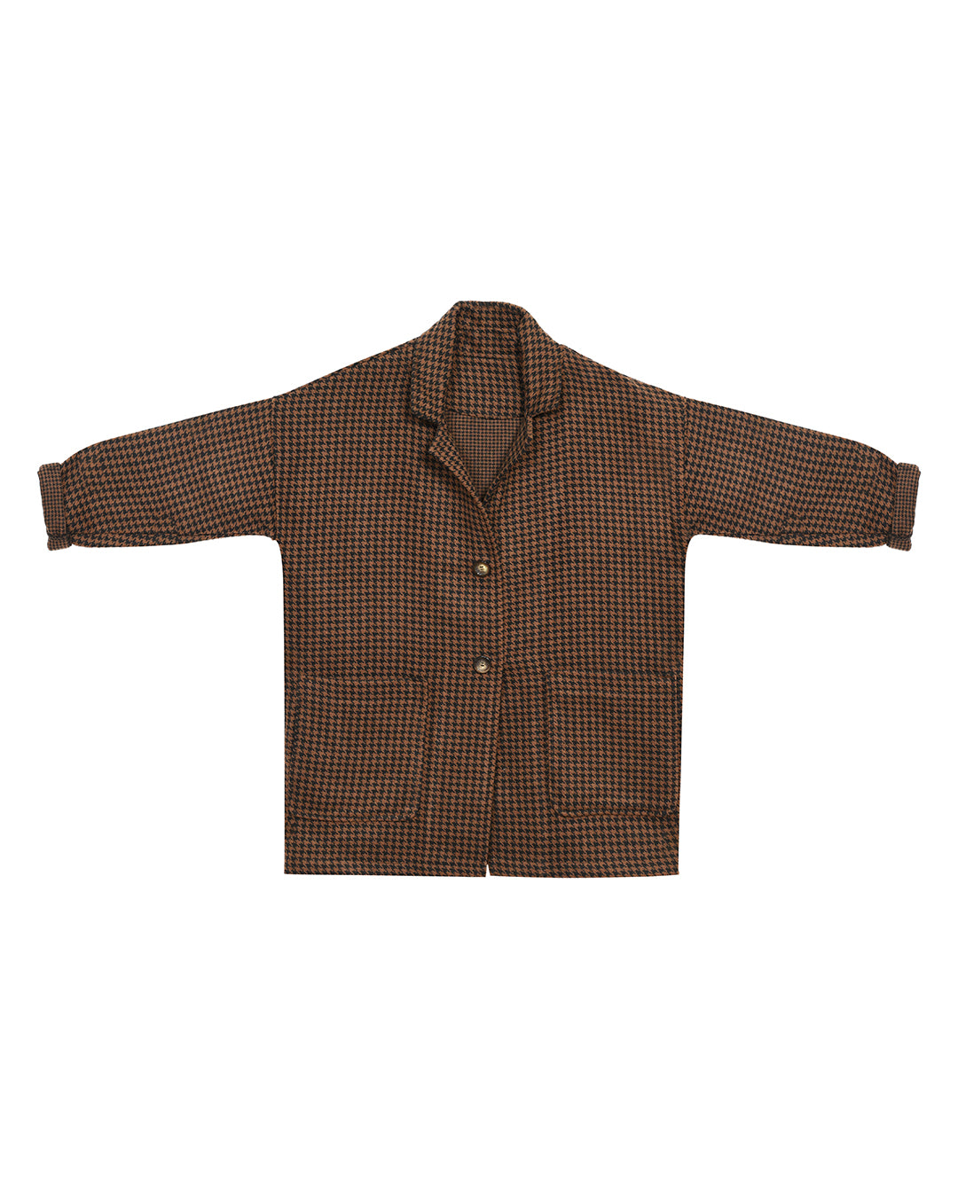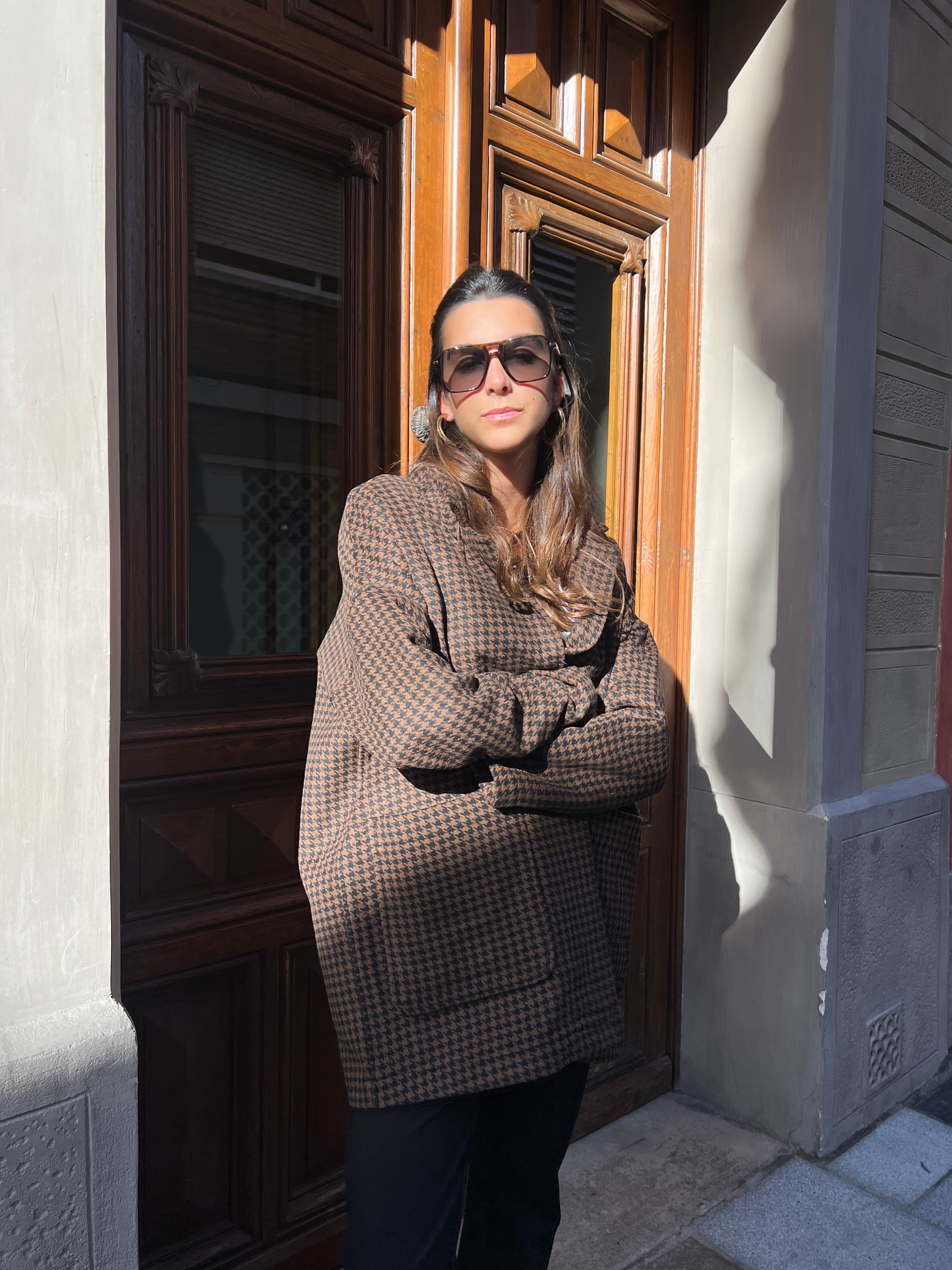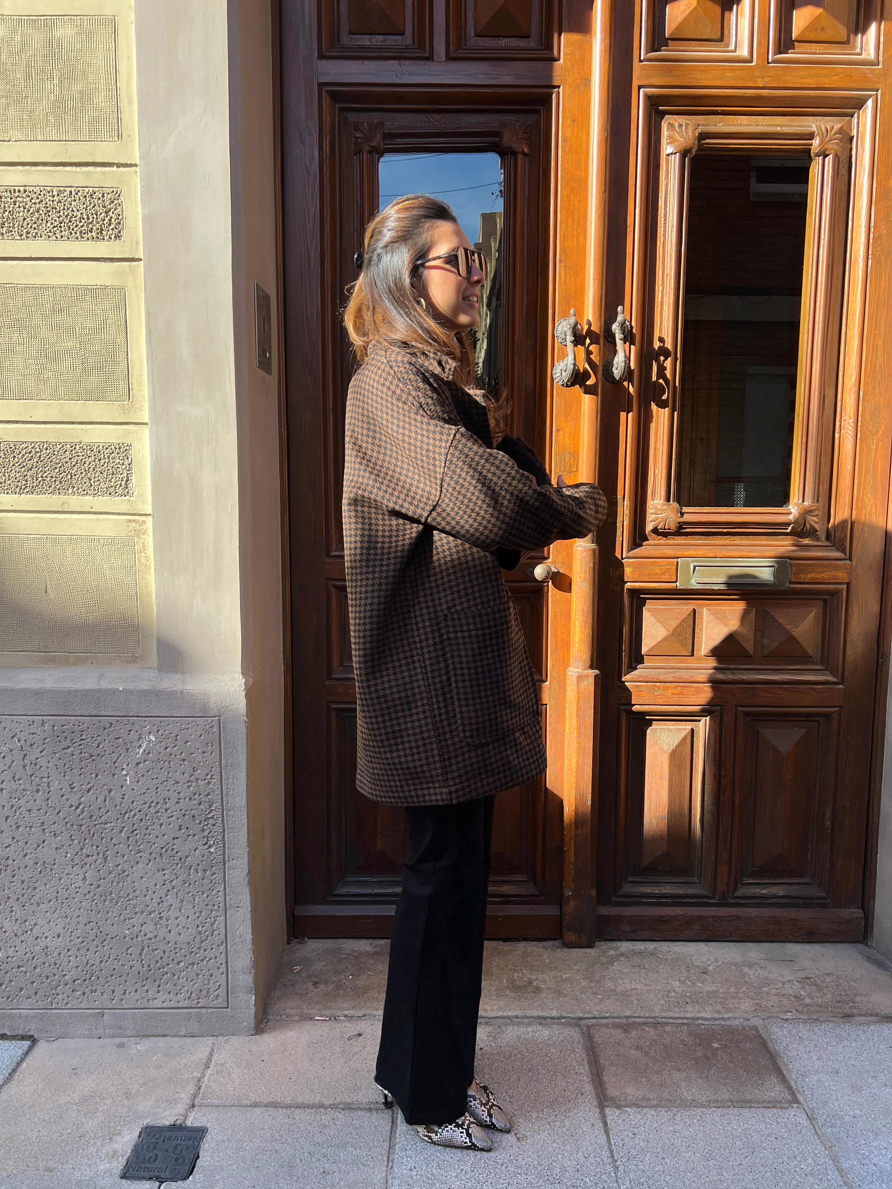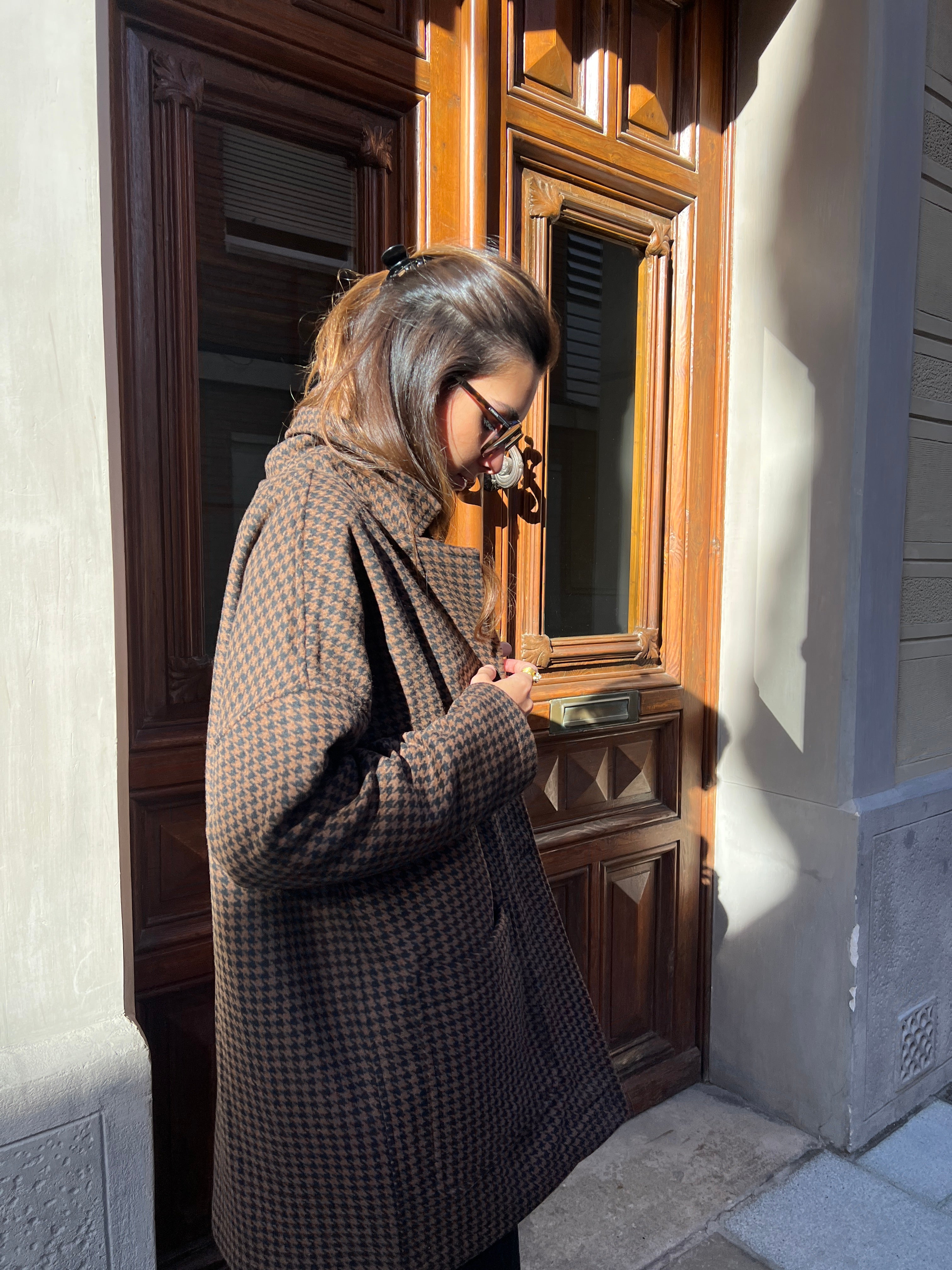 Abrigo de cuadros en pata de gallo que fusiona la elegancia clásica con un diseño contemporáneo. Confeccionado en tonos marrón y negro, destaca por su corte oversized que proporciona comodidad sin renunciar al estilo. Solapa estructurada, bolsillos funcionales y detalles frenales completan una pieza versátil ideal para crear looks sofisticados. Un básico reinventado que trasciende tendencias.