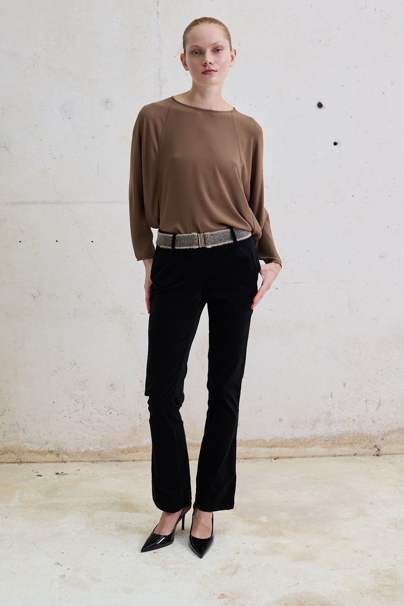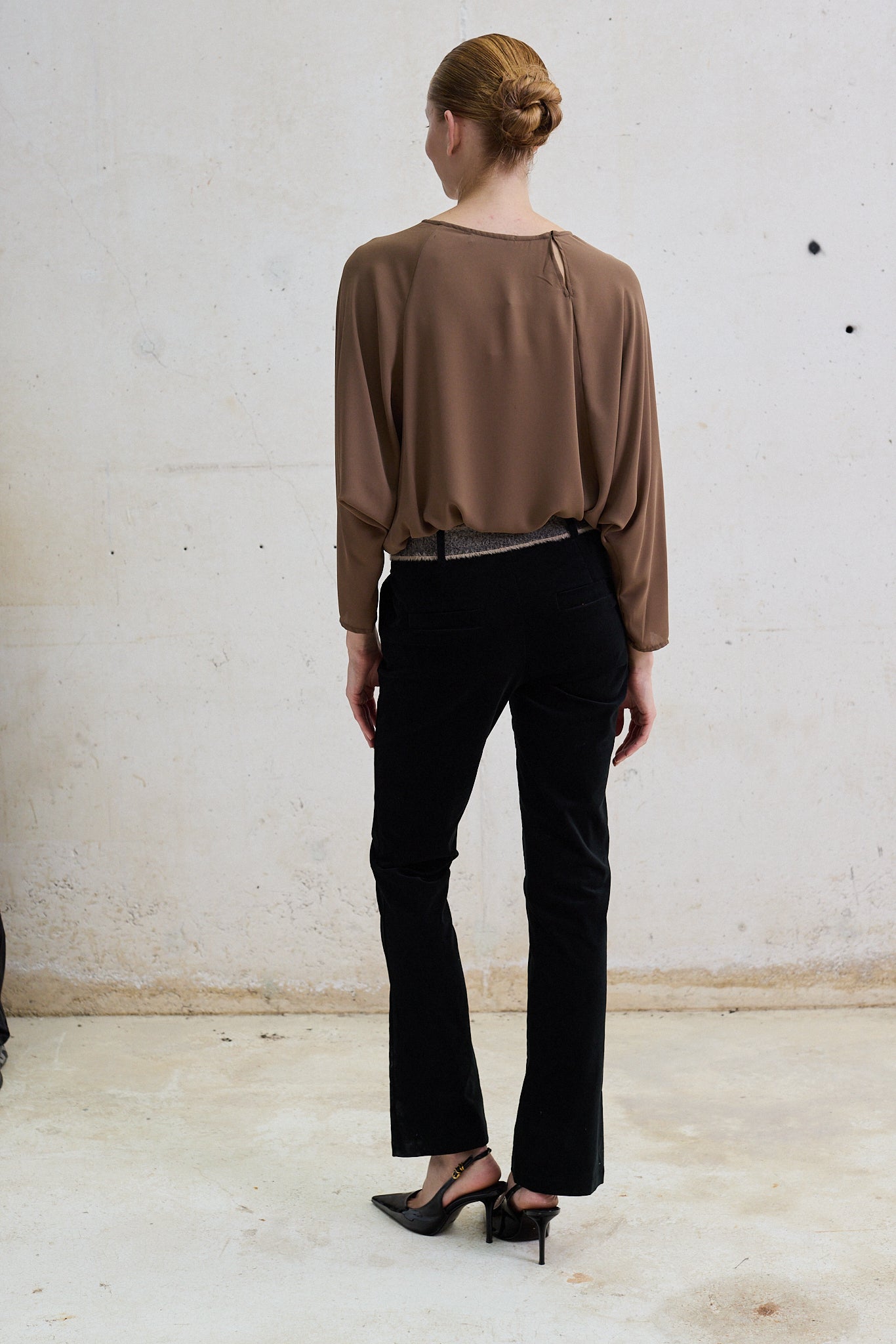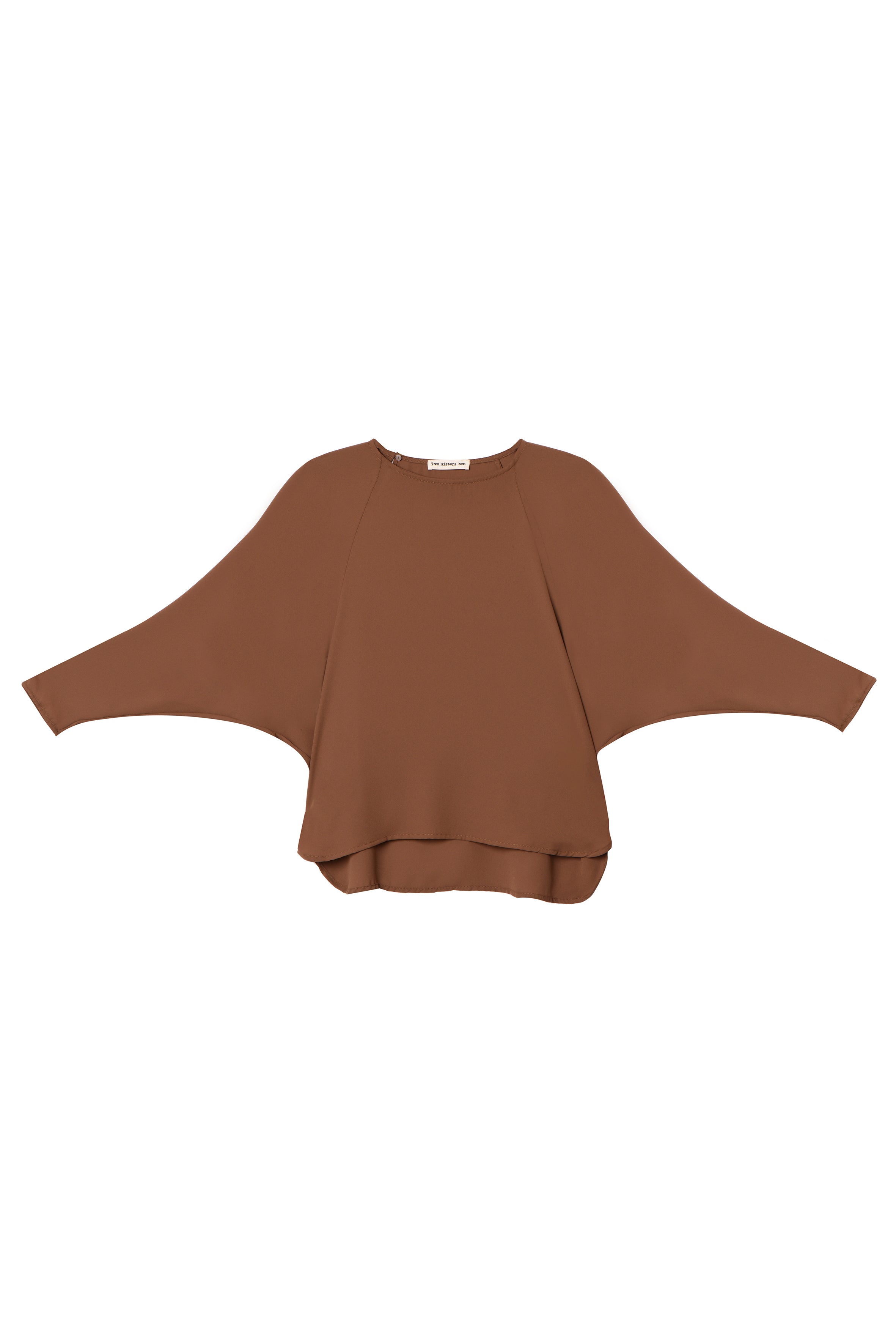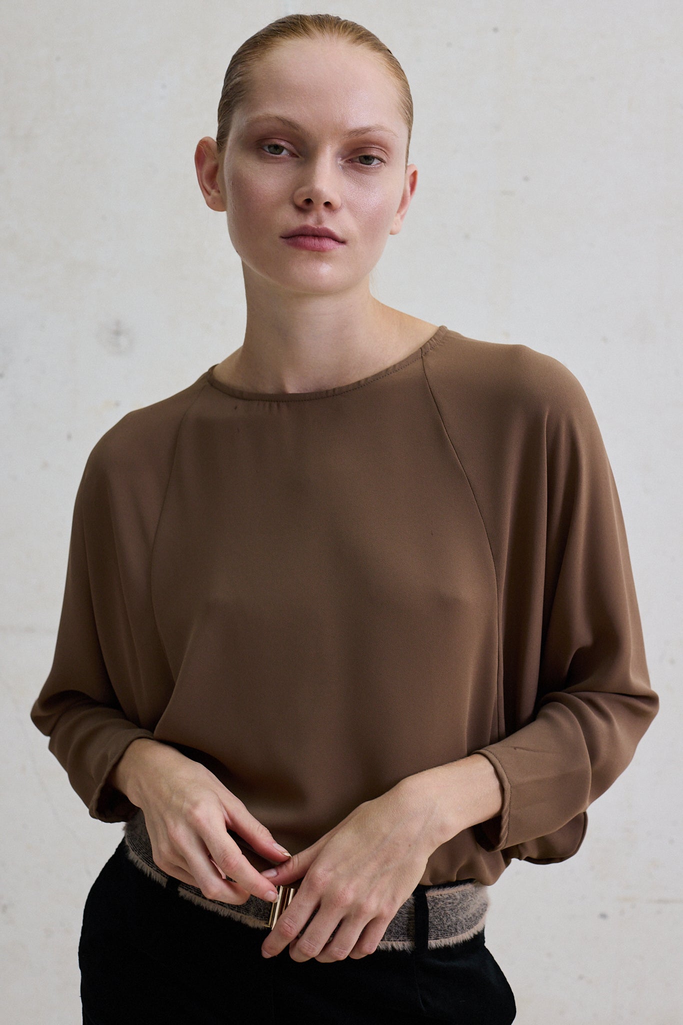 Blusa de crepé con cuello barco y manga murciélago es una opción sofisticada y chic que añade elegancia instantánea a cualquier atuendo. El tejido de crepé, conocido por su textura suave y fluida, cae de manera elegante sobre el cuerpo, creando un look refinado sin ser demasiado estructurado.