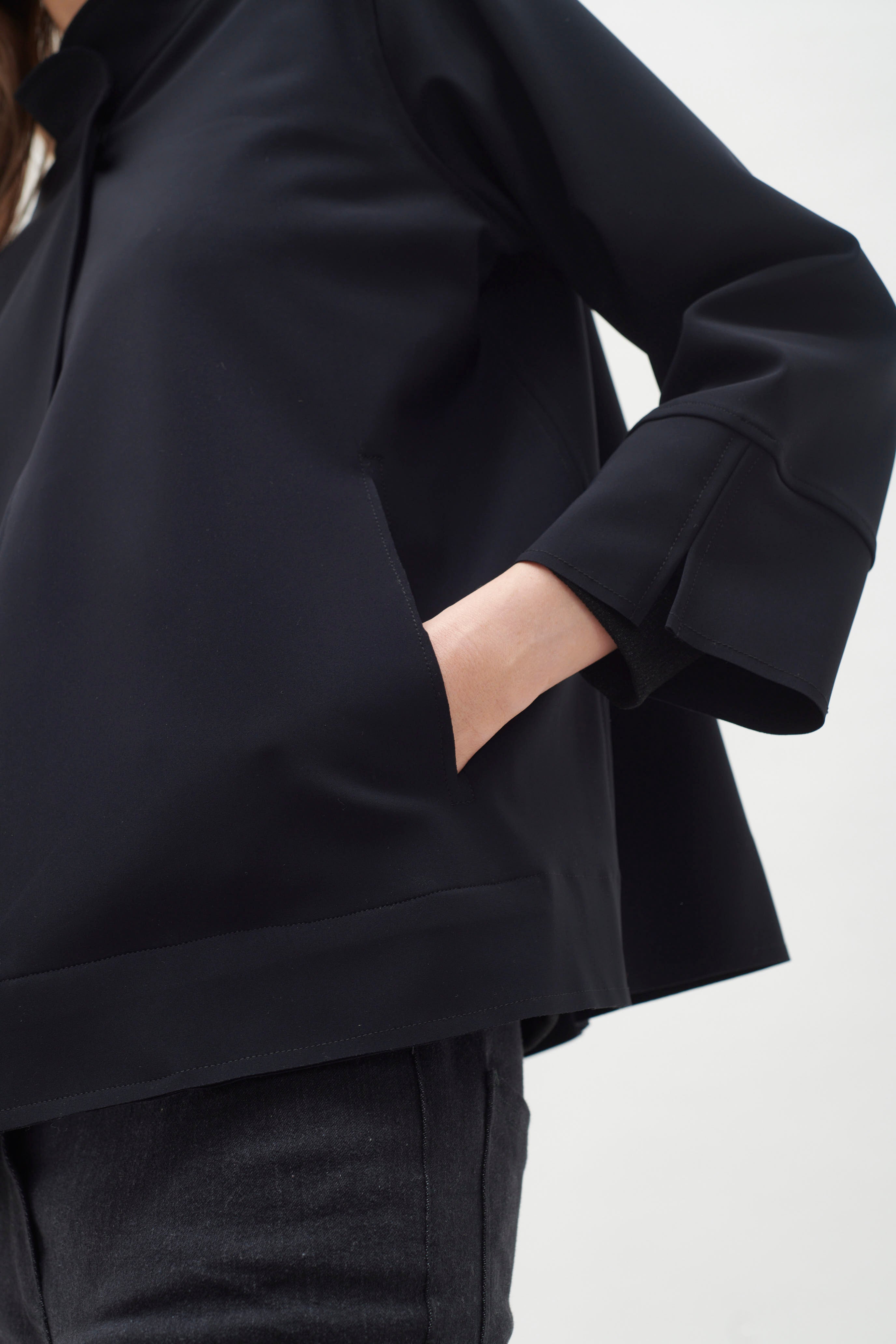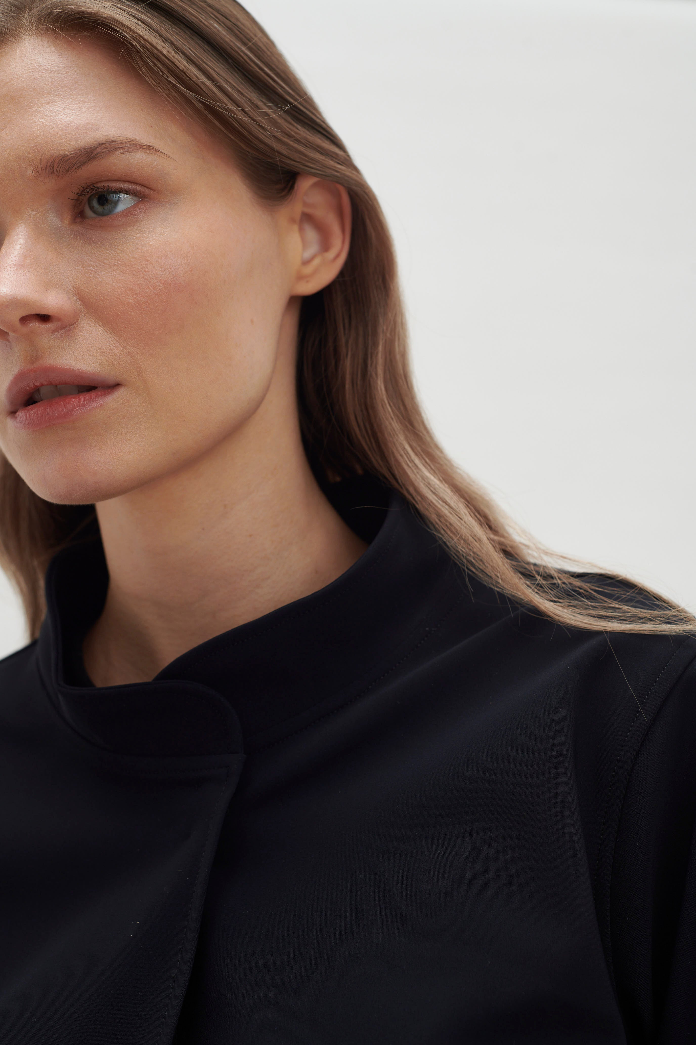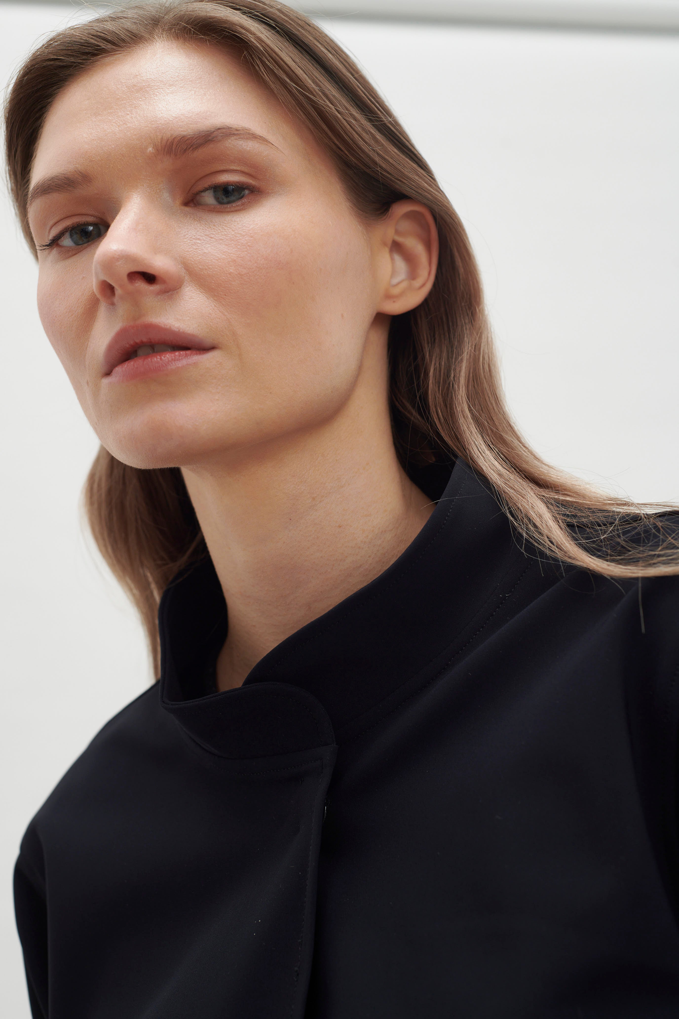 Gabardina en forma de evasé de neopreno es una pieza chic, atemporal y lujosa que aporta un toque de sofisticación a cualquier look. Su diseño en evasé, que se ajusta suavemente al cuerpo y se ensancha hacia abajo, realza la silueta de manera elegante, ofreciendo un efecto favorecedor para diferentes tipos de figura.