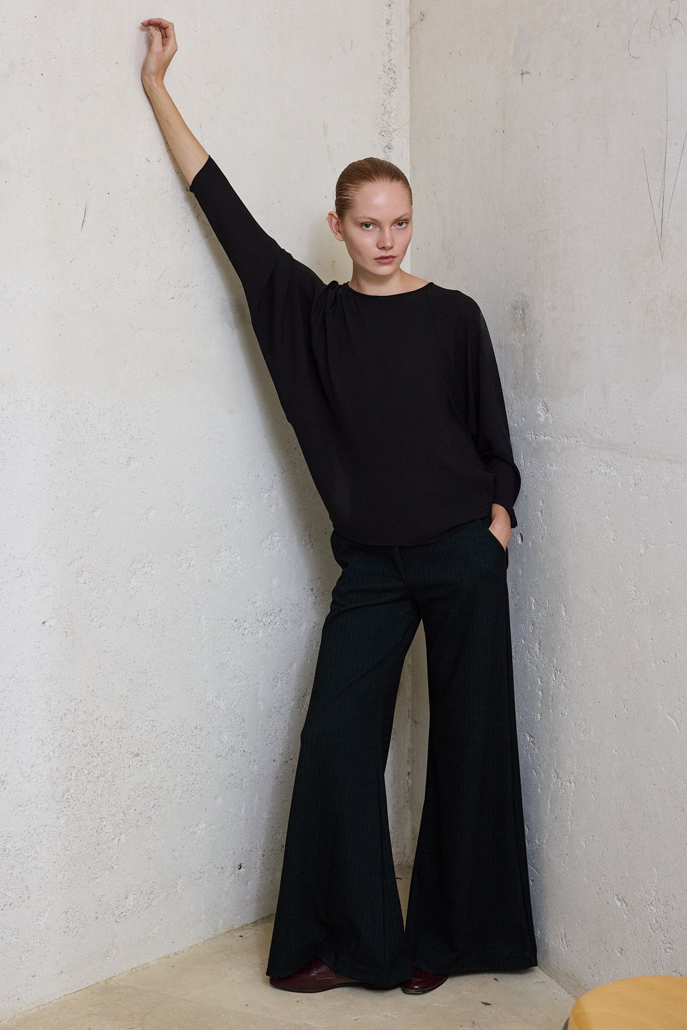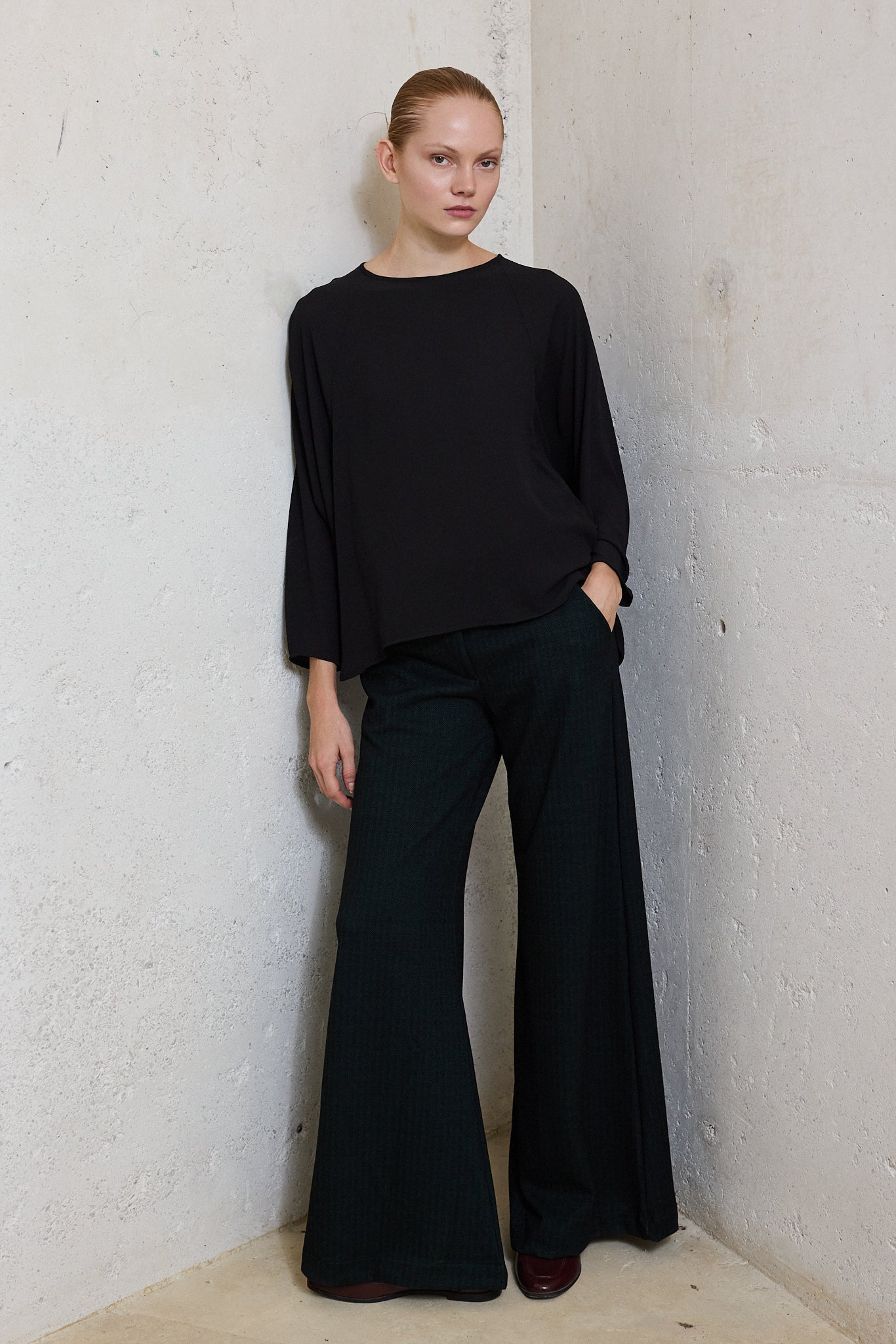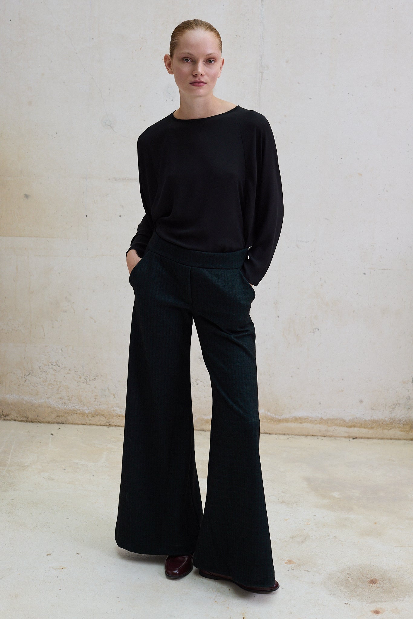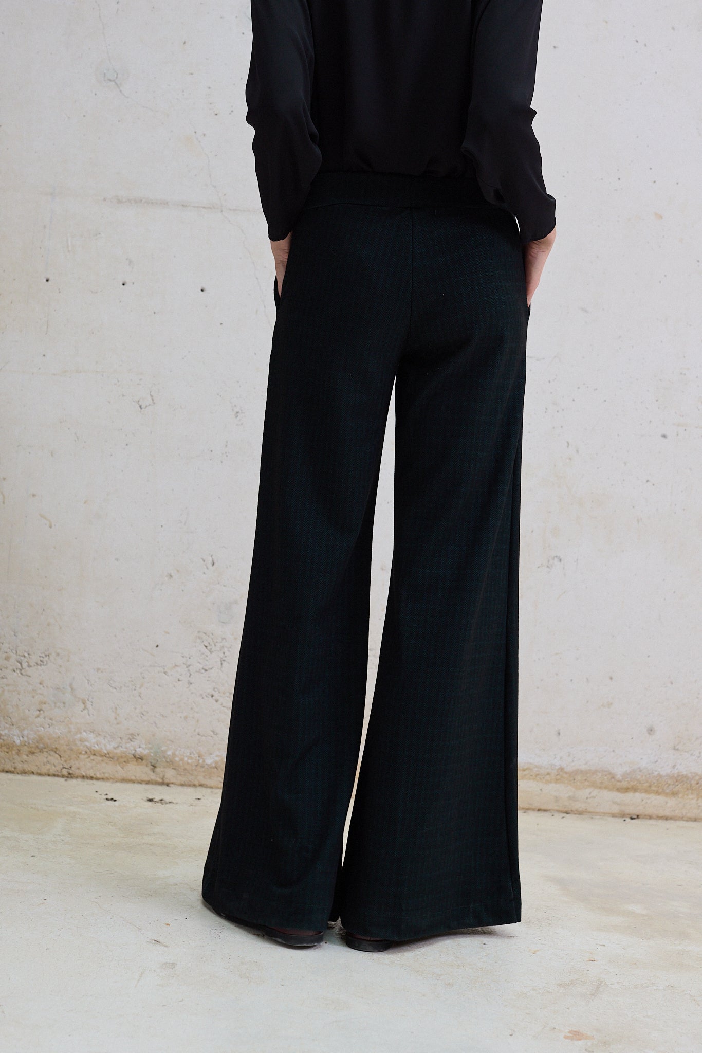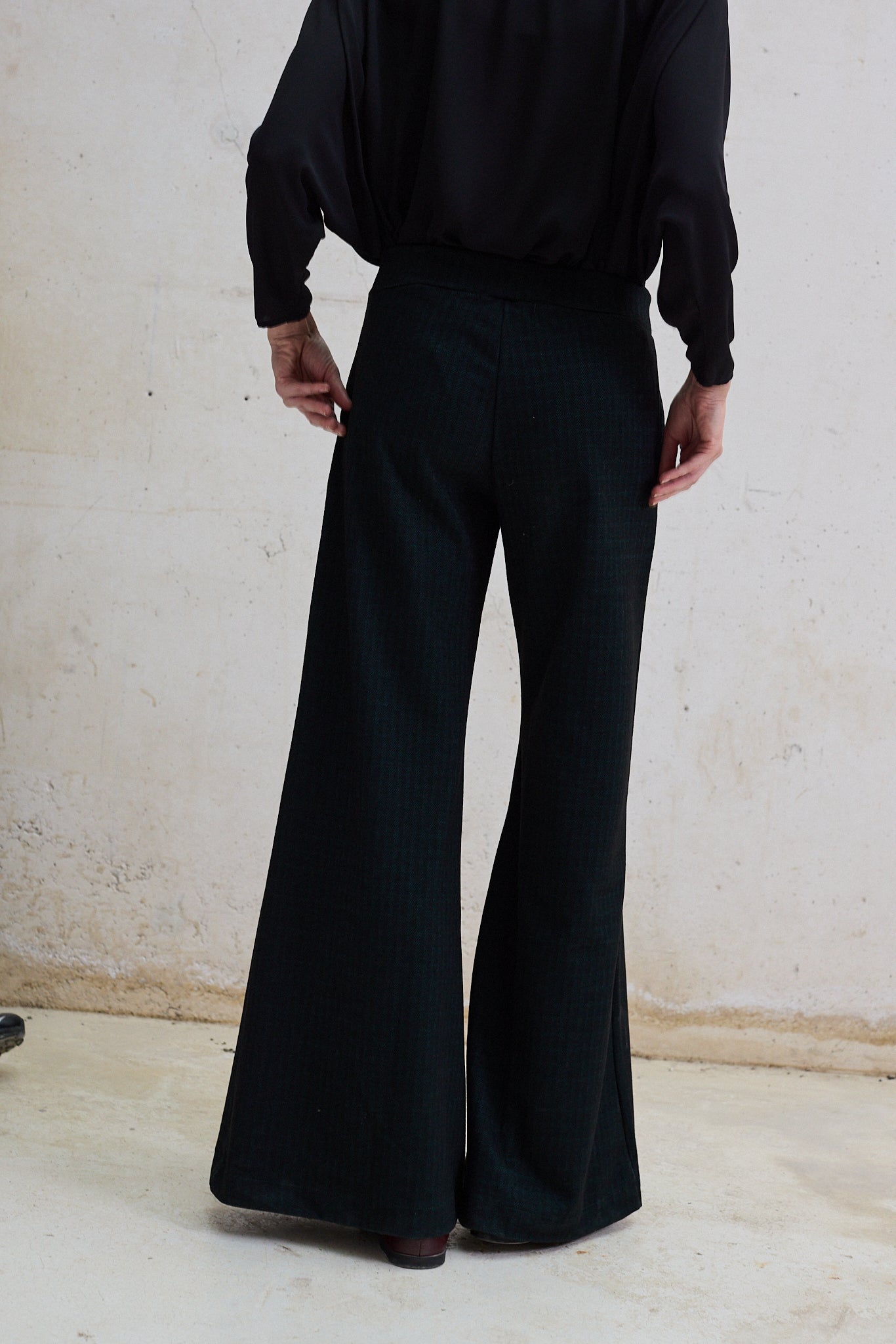 Este pantalón ejecutivo reversionado con estilo años 70 aporta un efecto campana que estiliza la pierna y crea un aire chic y sofisticado. Ideal para looks de oficina elegantes o combinaciones más modernas y atrevidas.