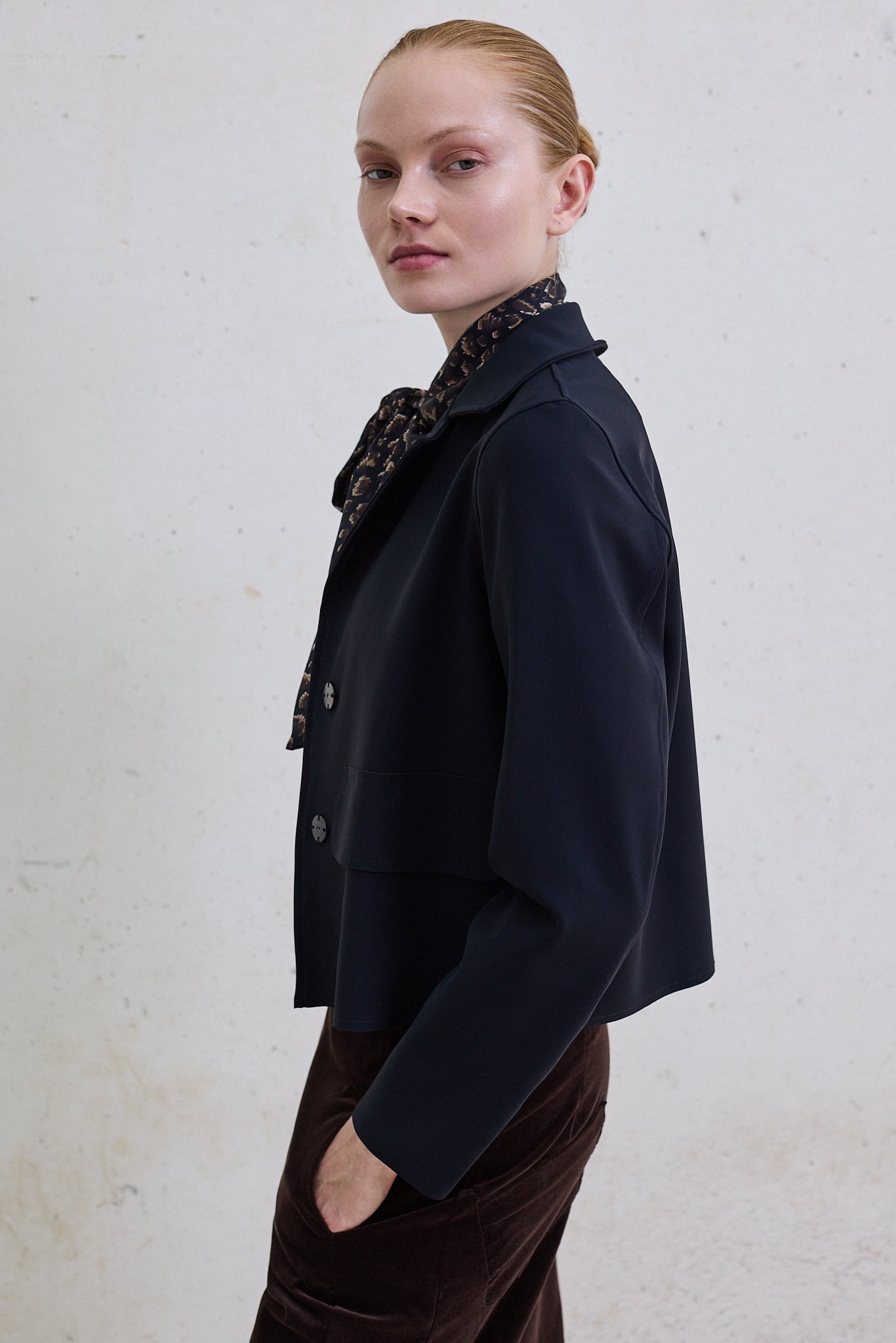 Gabardina corta de neopreno con un toque francés es una prenda imprescindible que combina elegancia y modernidad, diseñada para elevar cualquier look. El neopreno, con su textura estructurada y suave, aporta un aire contemporáneo y distintivo, manteniendo la forma y proporcionando comodidad en cada uso.Los bolsillos solapa frontales son un detalle práctico y estiloso que complementa el diseño de la chaqueta, añadiendo funcionalidad sin sacrificar la estética. Estos bolsillos, además de ser útiles, aportan un toque de sofisticación, lo que hace que la prenda sea perfecta para quienes buscan un equilibrio entre estilo y practicidad.