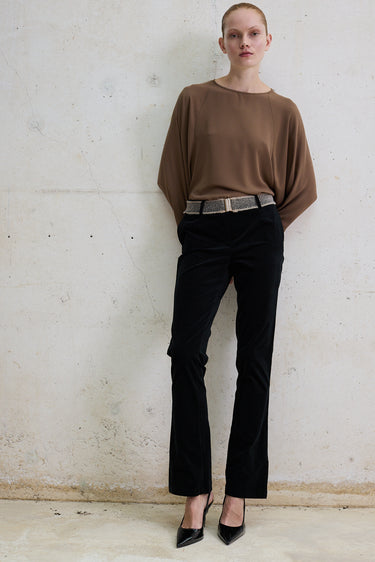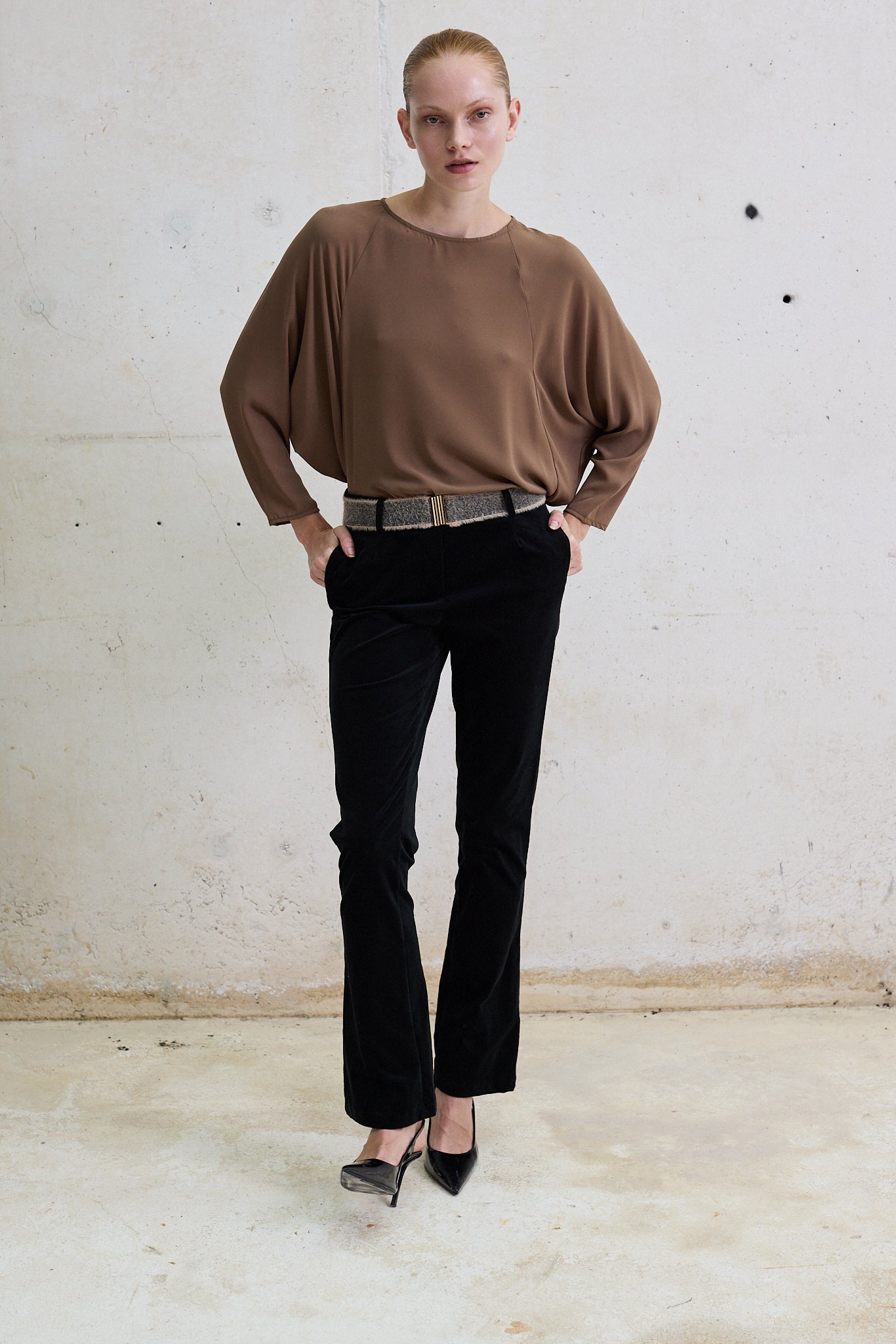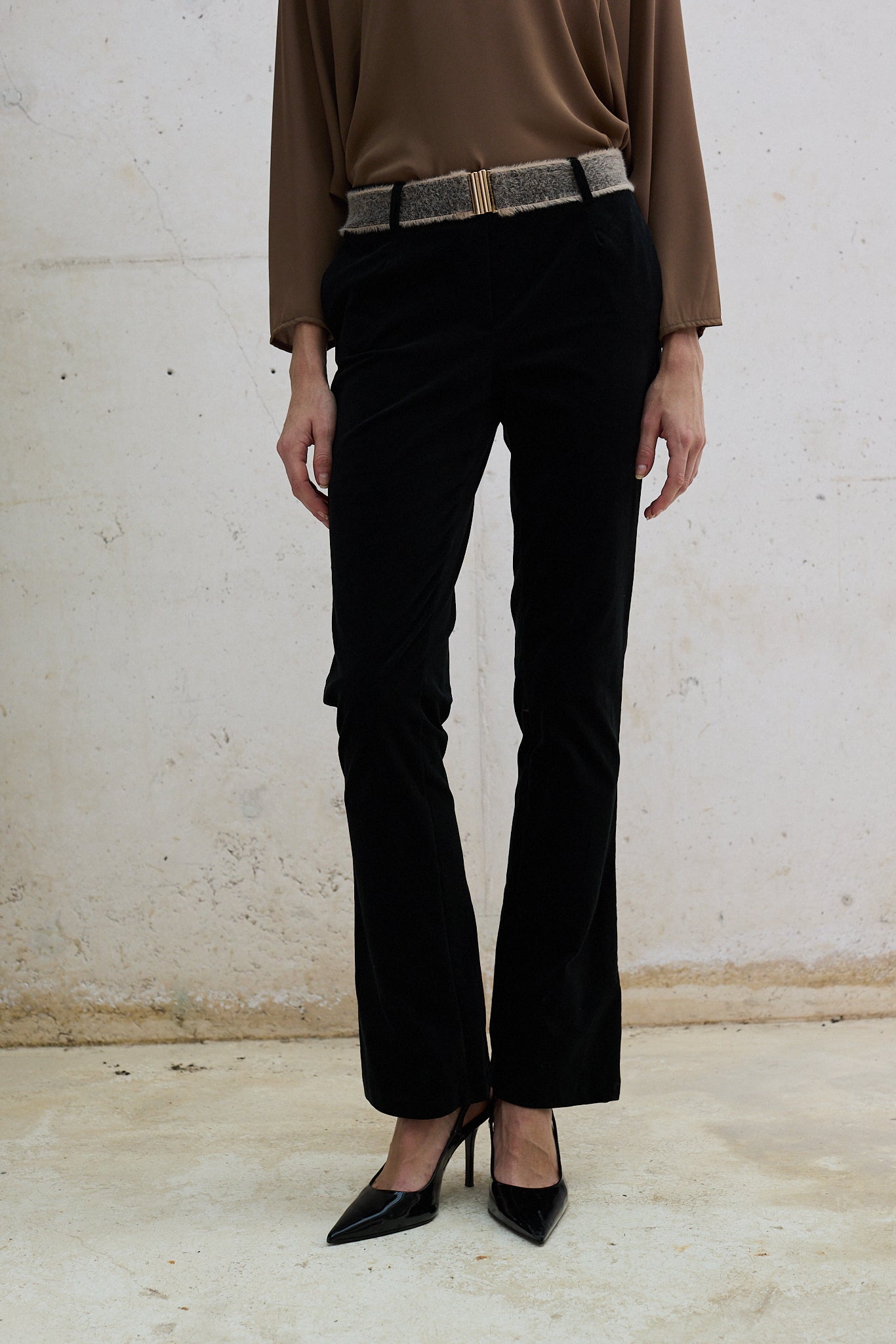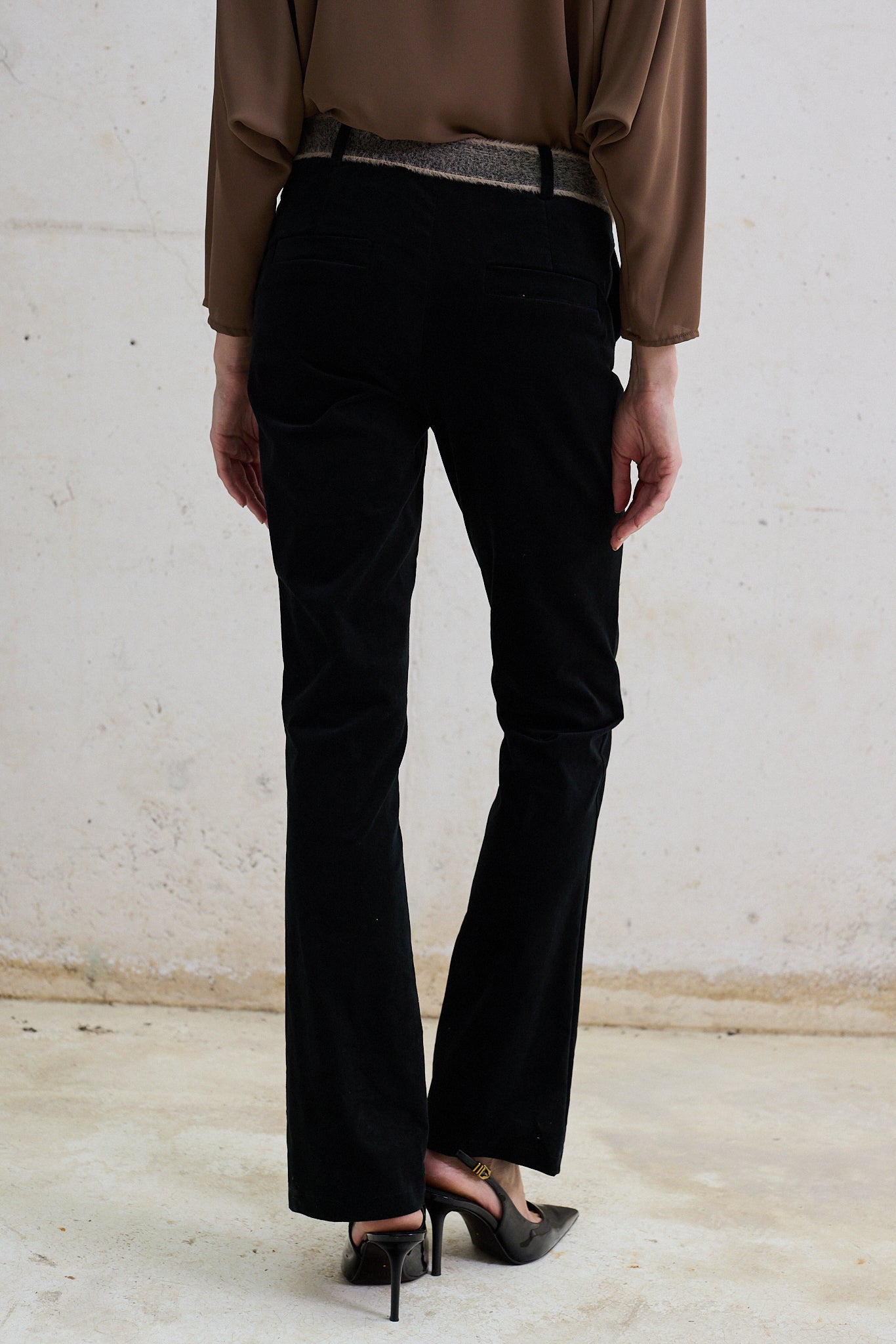 Este pantalón de tiro bajo está diseñado para quienes buscan estilo y comodidad en una sola prenda. Su tejido de punto ofrece suavidad y un ajuste perfecto, realzando tu figura gracias a su efecto push up. Con un diseño de pierna acampanada, este pantalón no solo estiliza, sino que alarga visualmente las piernas, aportando un toque sofisticado y moderno. Además, cuenta con trabillas para cinturón, permitiendo personalizar tu look y ajustar la prenda a tu medida. La cinturilla elástica añade comodidad y practicidad, haciendo de este pantalón una elección ideal para un estilo casual pero a la vez refinado